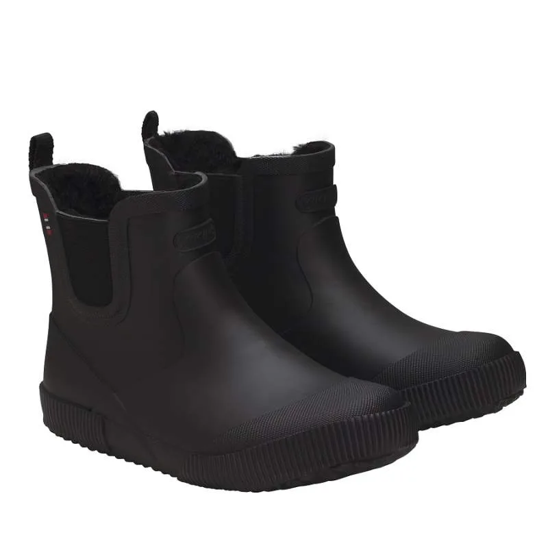 Ботинки выполнены вручную из натурального каучука, не содержат ПВХ и подходят веганам. Внутри — мягкая утеплённая подкладка (искусственный мех), а эластичные вставки по бокам облегчают надевание. Съёмная стелька упрощает уход, а светоотражающие детали повышают безопасность в тёмное время суток.