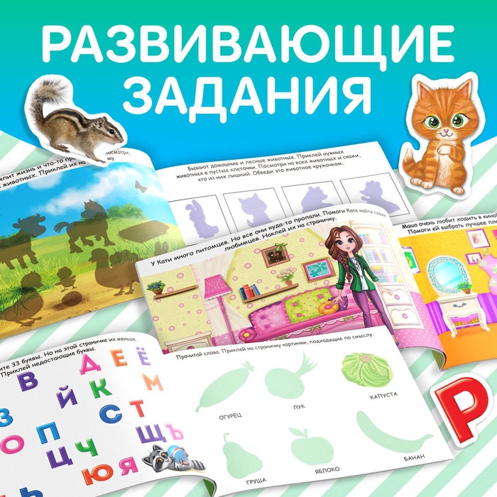 На каждой странице находятся задания, где необходимо приклеить картинки с соответствующими персонажами или их определённое количество. Упражнения положительно влияют на развитие мелкой моторики, внимания, речи и расширение кругозора.