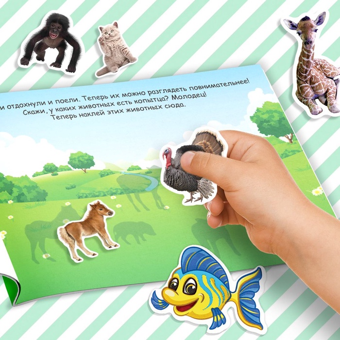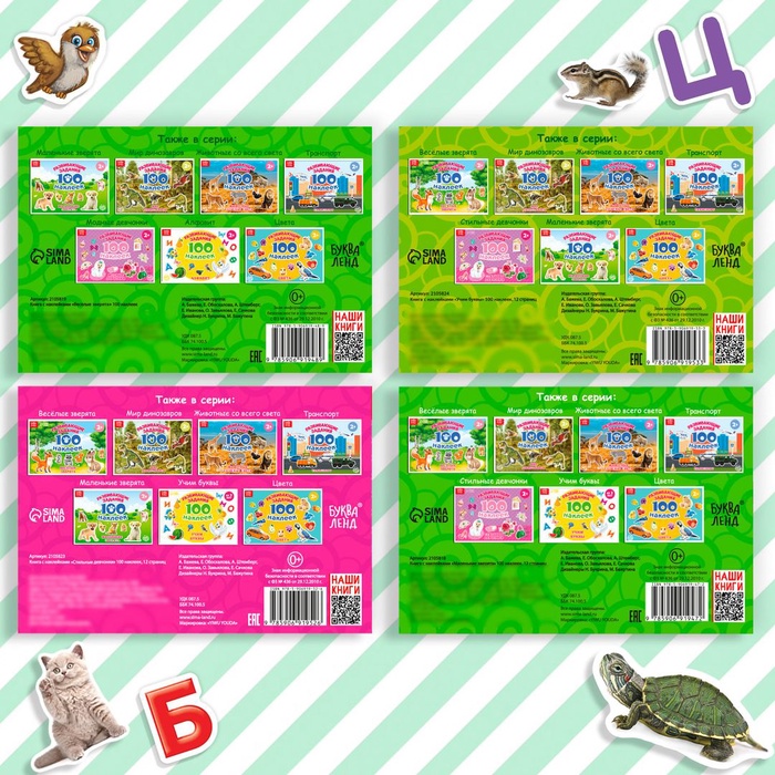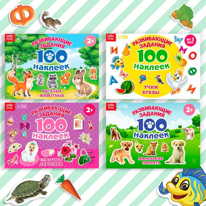 В каждом альбоме представлено 100 наклеек с красочными изображениями животных, растений, букв, фруктов, овощей и других важных предметов окружающего мира. Яркие картинки положительно влияют на визуальное восприятие малыша, память и воображение.