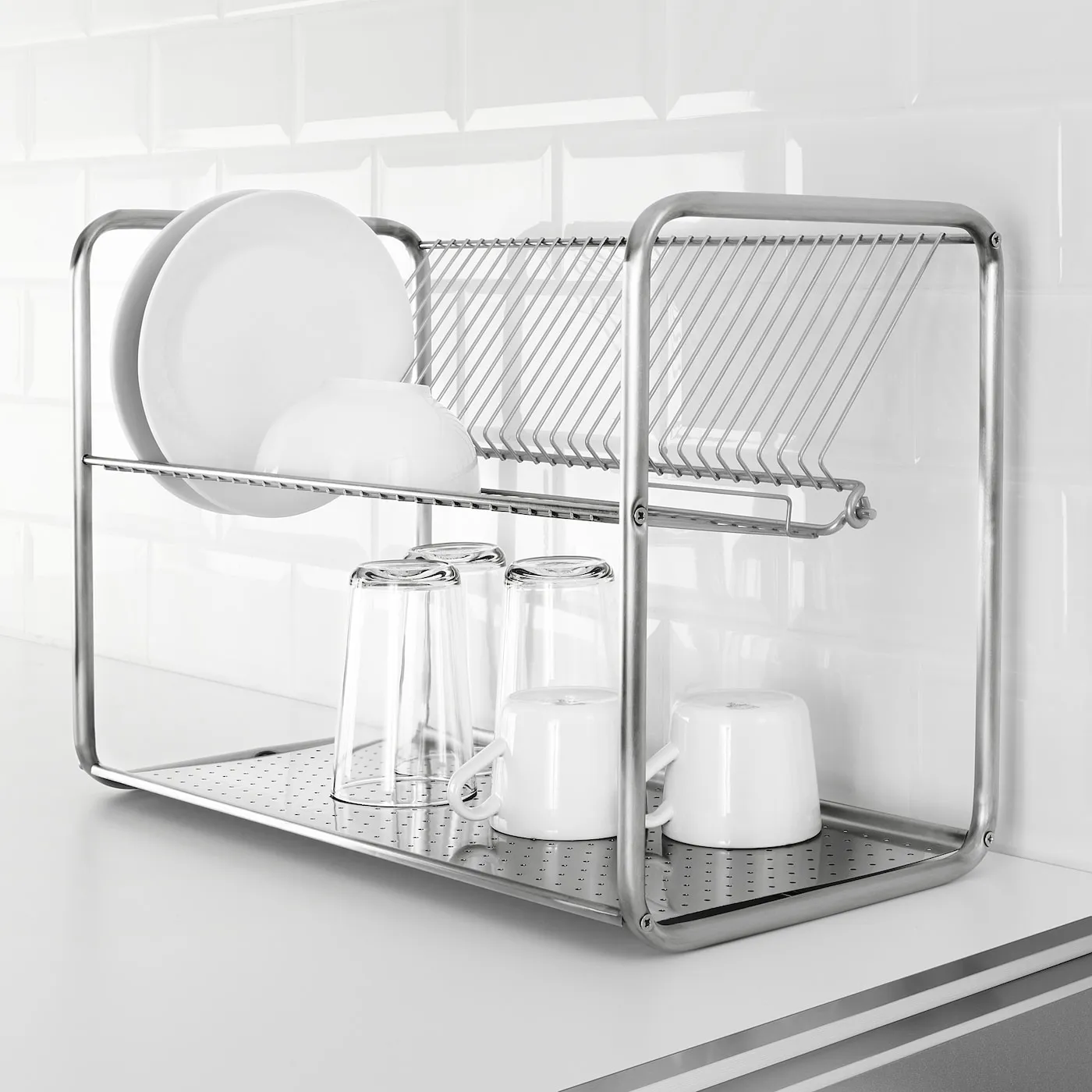 Эта сушилка из нержавеющей стали вмещает 29 тарелок, а также множество мисок и бокалов. Понравился стиль? В той же серии есть подходящие подставки для столовых приборов и кухонных принадлежностей.
