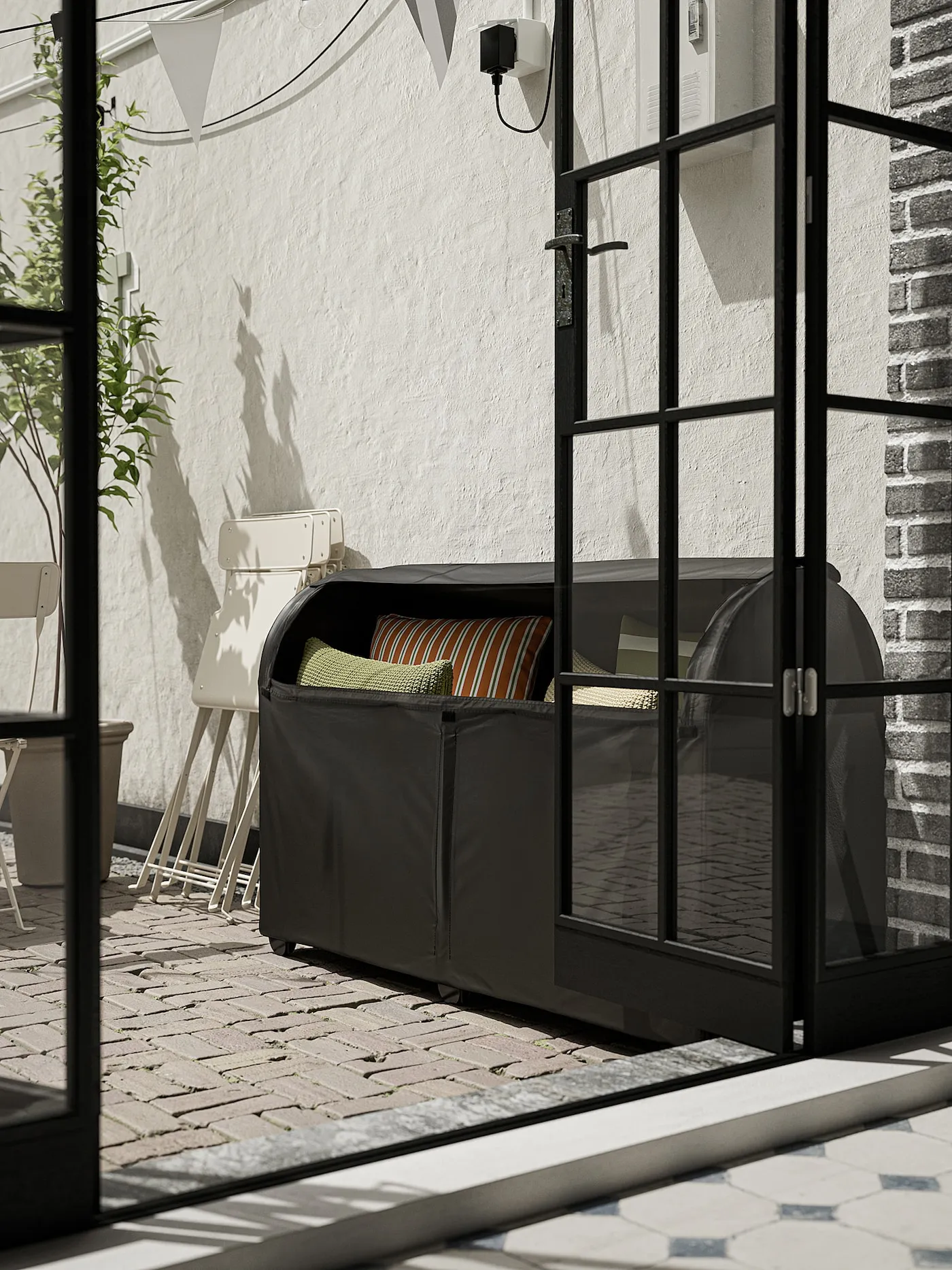 Этот водонепроницаемый ящик защитит ваши уличные подушки и коврики, обеспечивая порядок, когда они не используются. Легко перемещается и занимает минимум места – идеально подходит для размещения возле стены.