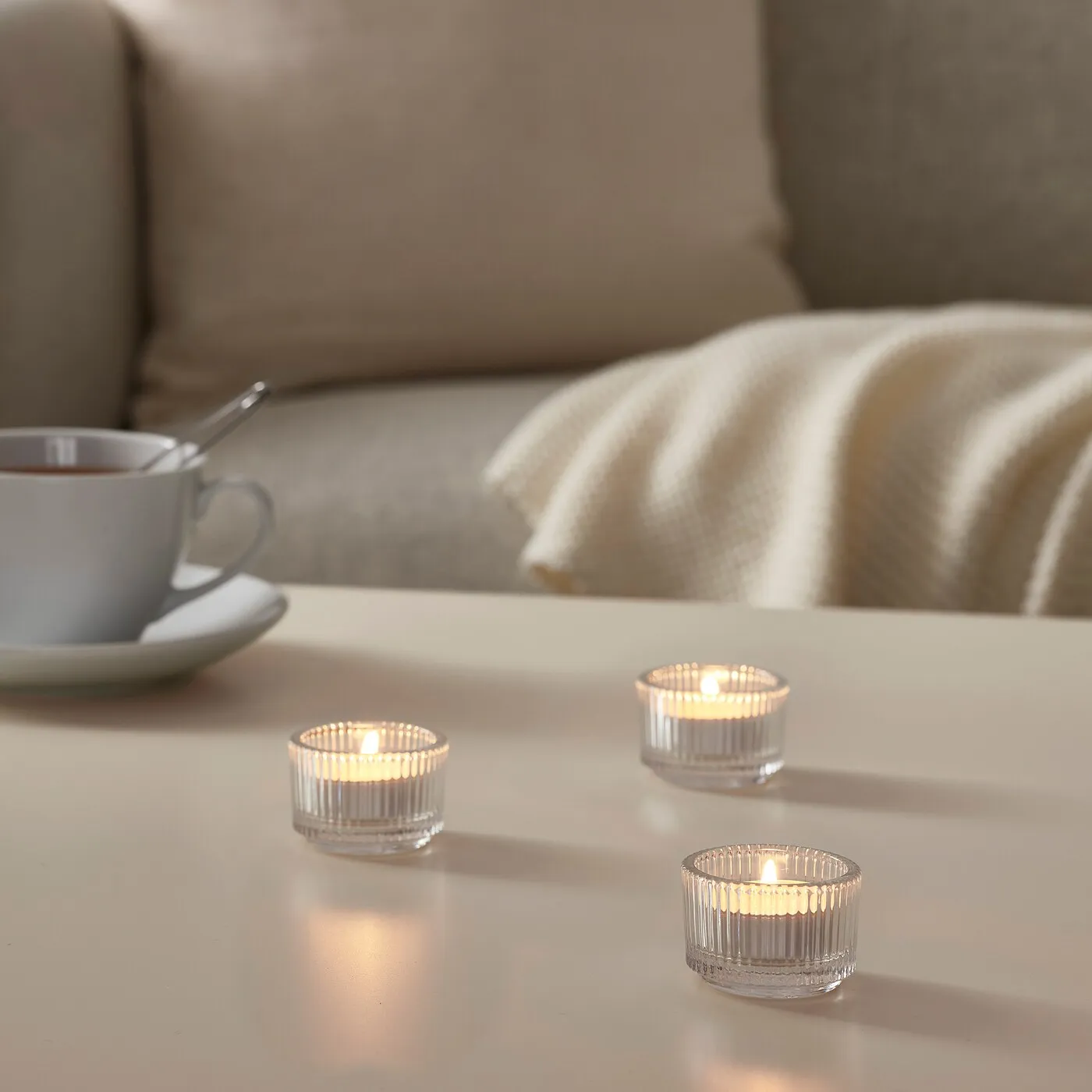 Прозрачное стекло отражает и усиливает теплое свечение пламени свечи.