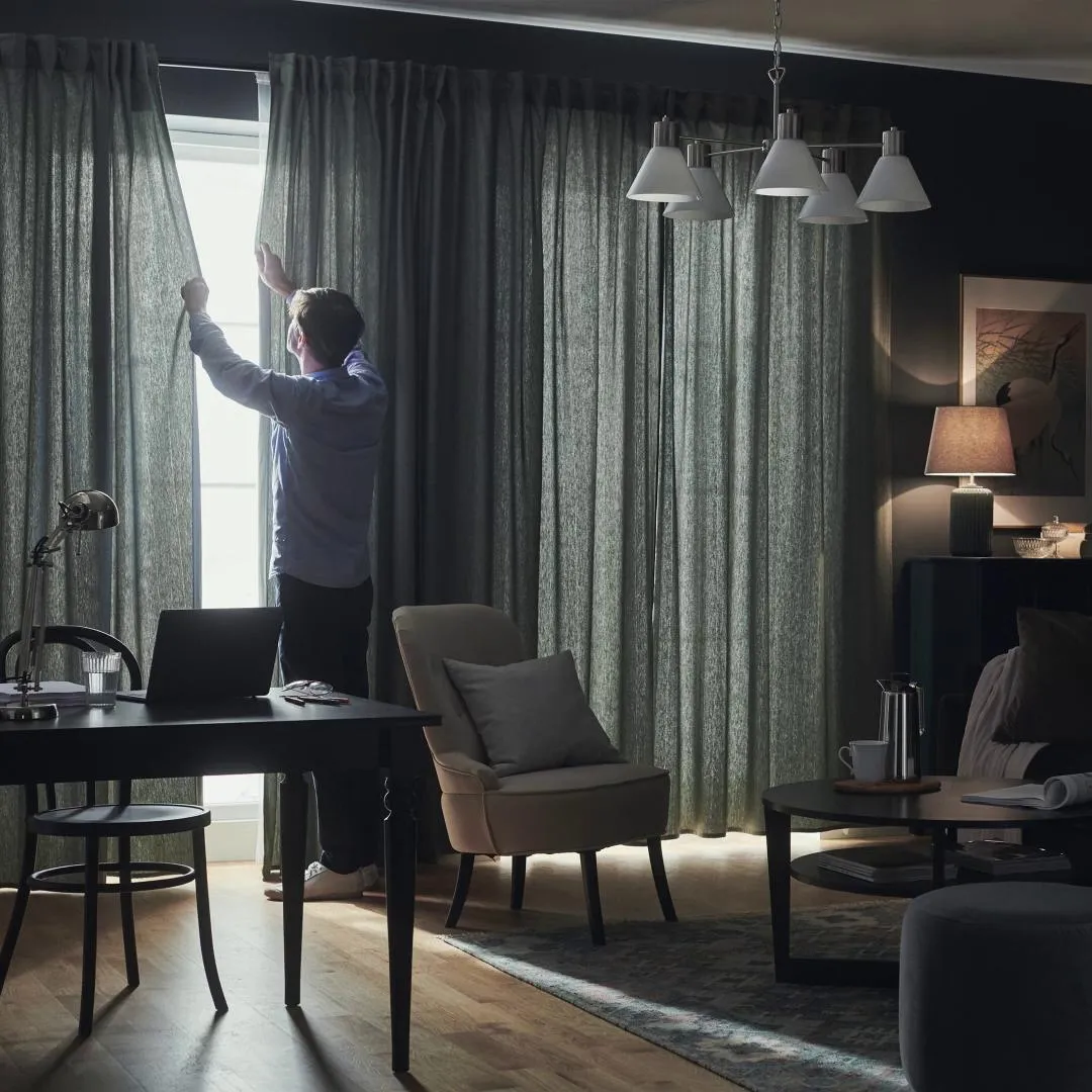Ткань затемняющих штор пропускает небольшое количество света и не даёт бликов на экране телевизора. Они обеспечивают высокий уровень конфиденциальности, так как снаружи едва различимы силуэты и свет.