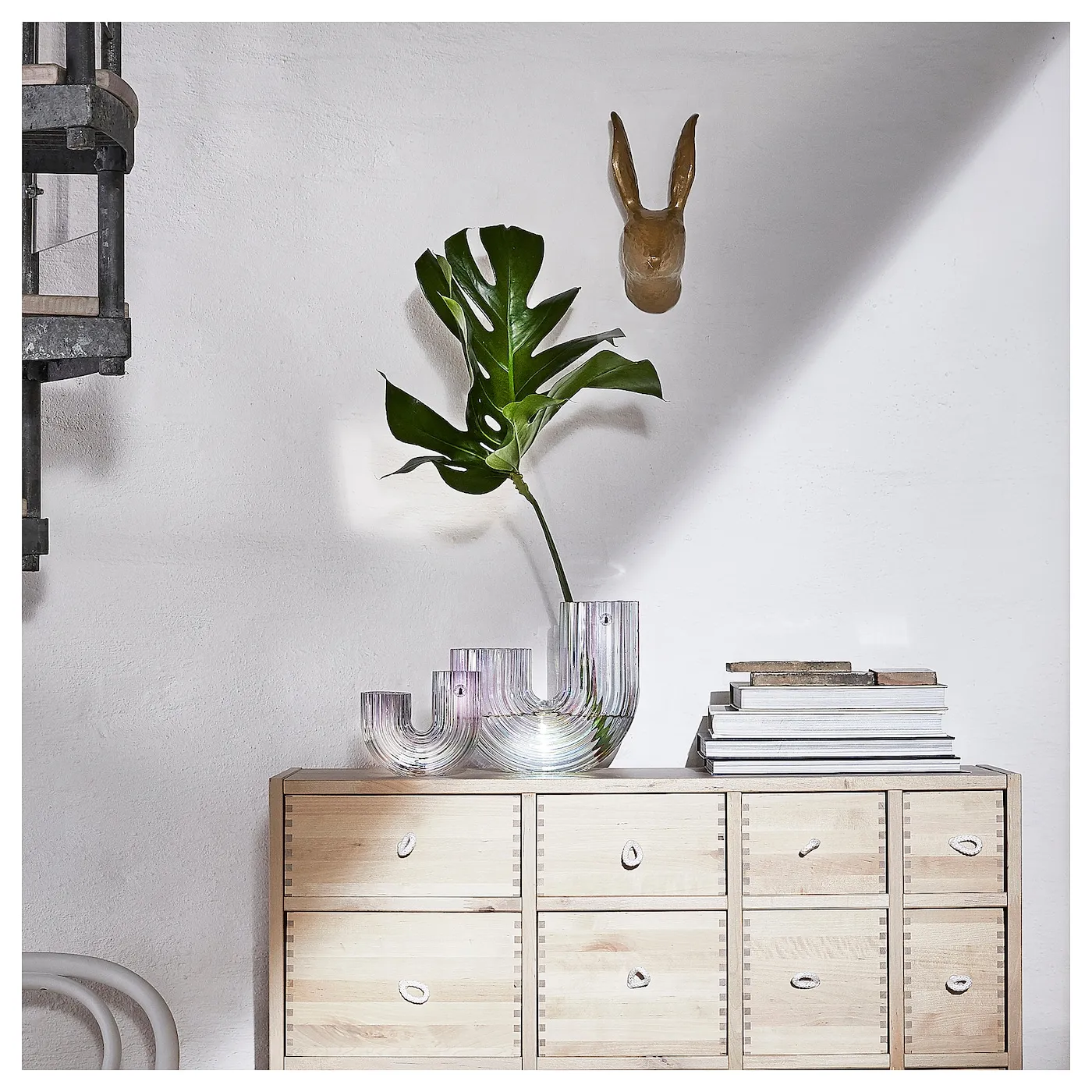 Ваза RÄFFELBJÖRK, разработанная Лизой Хилланд, вдохновлена радугой, обладает плавной игривой формой и переливающейся отделкой. Поставьте в неё свои любимые цветы или используйте как красивую стеклянную скульптуру.