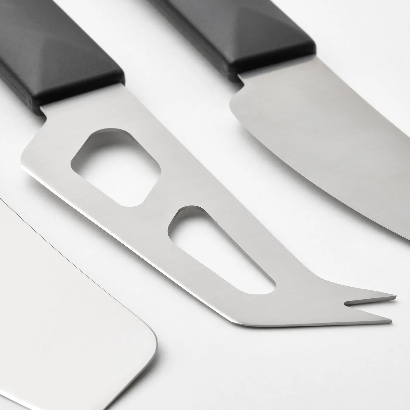 В комплект входят: 1 нож для твердых сыров, 1 нож для полутвердых сыров и 1 нож для намазывания мягких сыров.