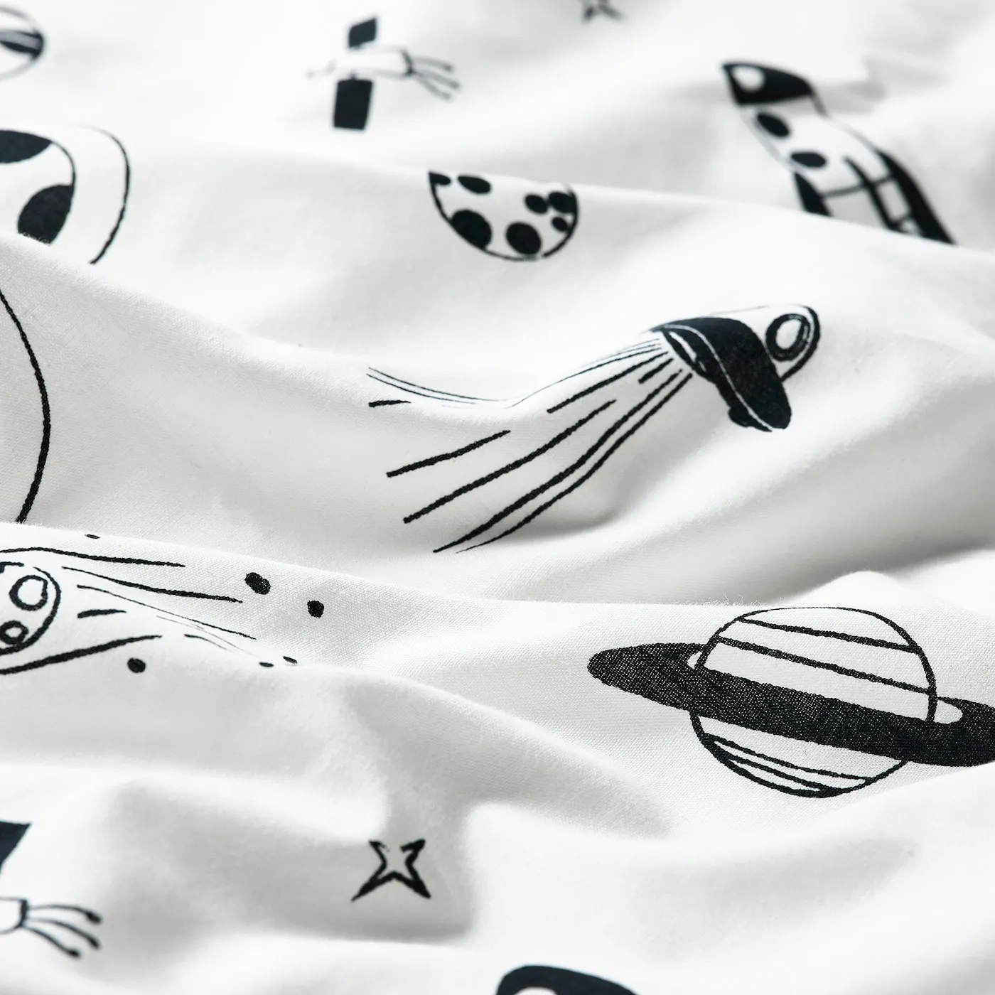 На белом хлопково-вискозном пододеяльнике изображены черные космические корабли и ракеты среди планет, лун и звезд. Он создан для того, чтобы детская кроватка стала уютной. Настоящая мечта для маленьких астронавтов.