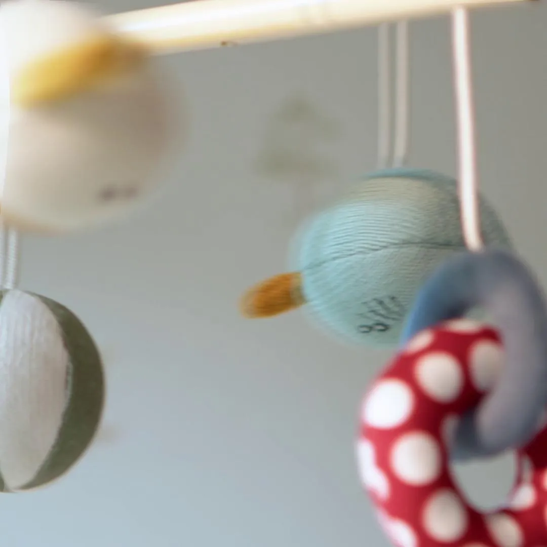 Этот мобиль с мягкими круглыми фигурками различных цветов становится ярким украшением над пеленальным столиком. Именно то, что нужно для создания спокойной атмосферы при смене подгузников.