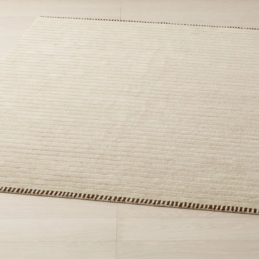 Бежевый с белыми полосами или белый с бежевыми полосами? Все зависит от того, под каким углом вы смотрите на этот сделанный вручную шерстяной ковер. Удивительный элемент, который непременно впечатлит ваших гостей.