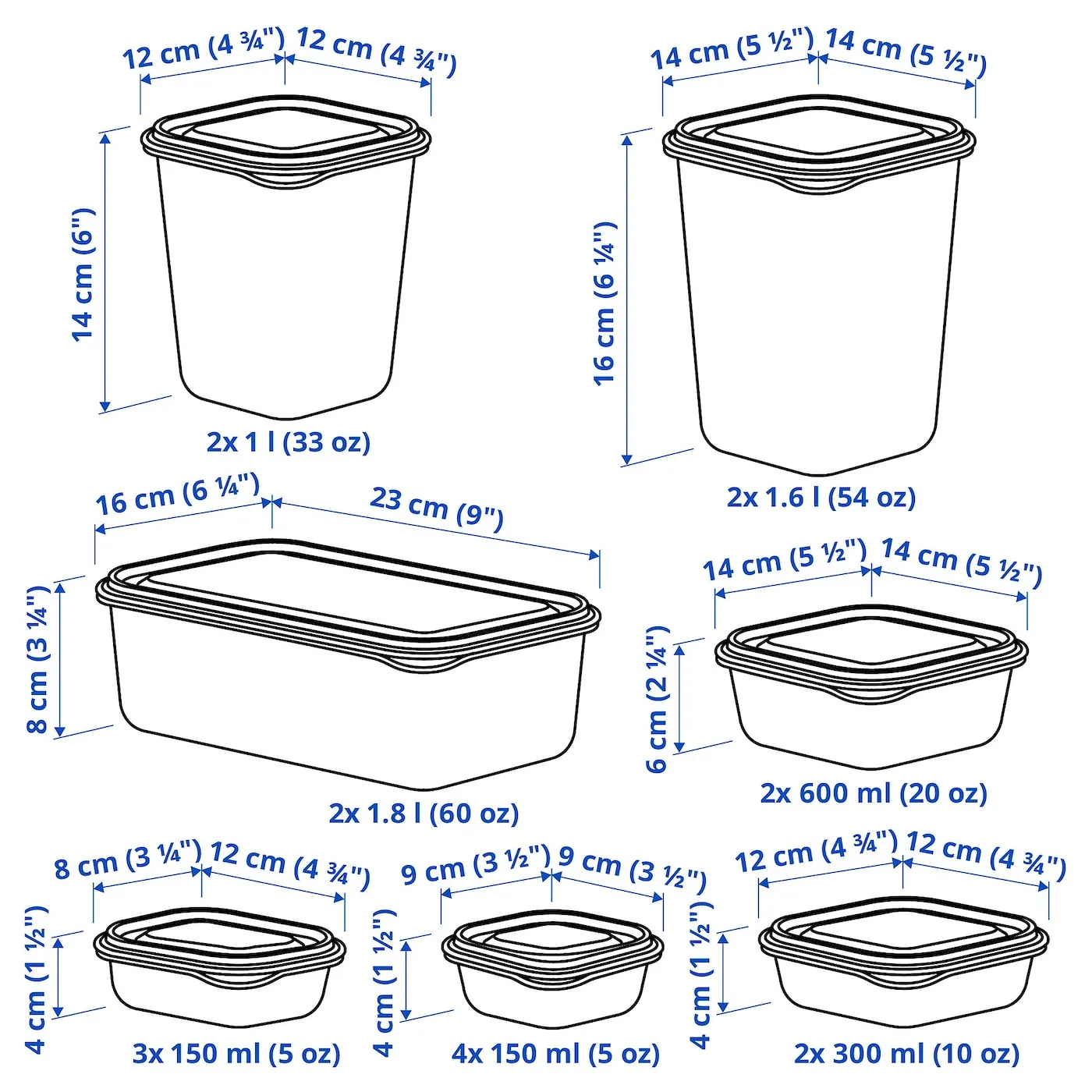 Состав: 4 контейнера (9х9х4 см, 150 мл), 3 контейнера (12х8х4 см, 150 мл), 2 контейнера (12х12х4 см, 300 мл), 2 контейнера (12х12х14 см, 1 л), 2 контейнера (14х14х6 см, 600 мл), 2 контейнера (14х14х16 см, 1,6 л) и 2 контейнера (23х16х8 см, 1,8 л).