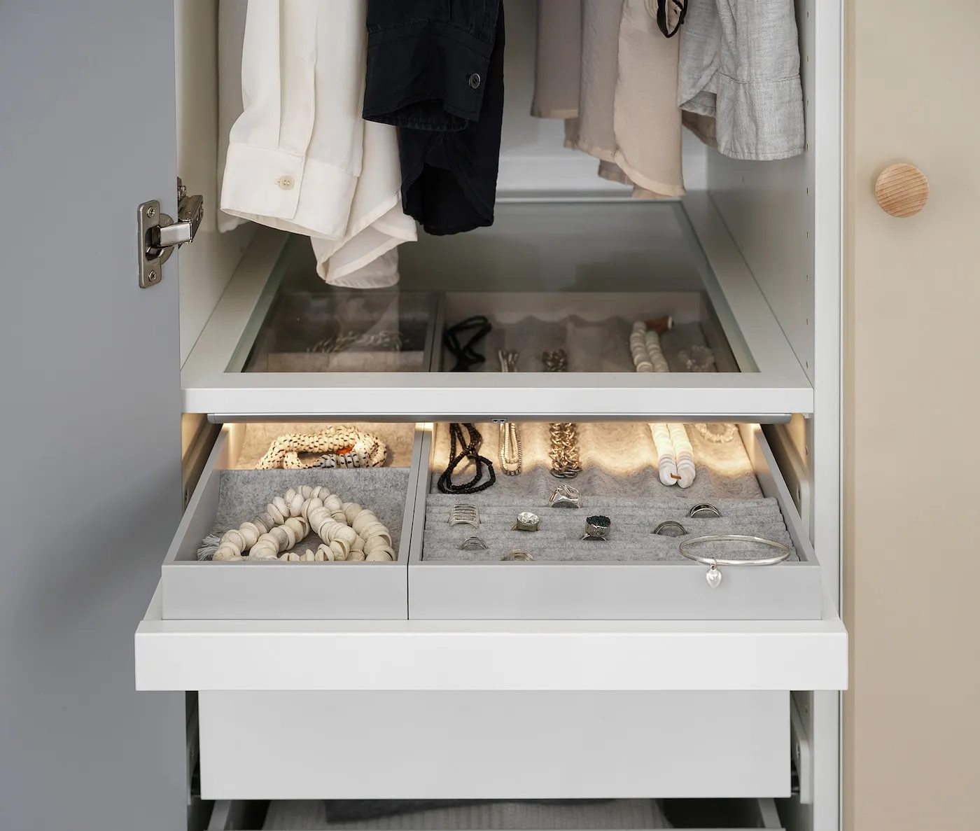 Можно дополнить стеклянной полкой KOMPLEMENT для обзора содержимого лотка сверху.