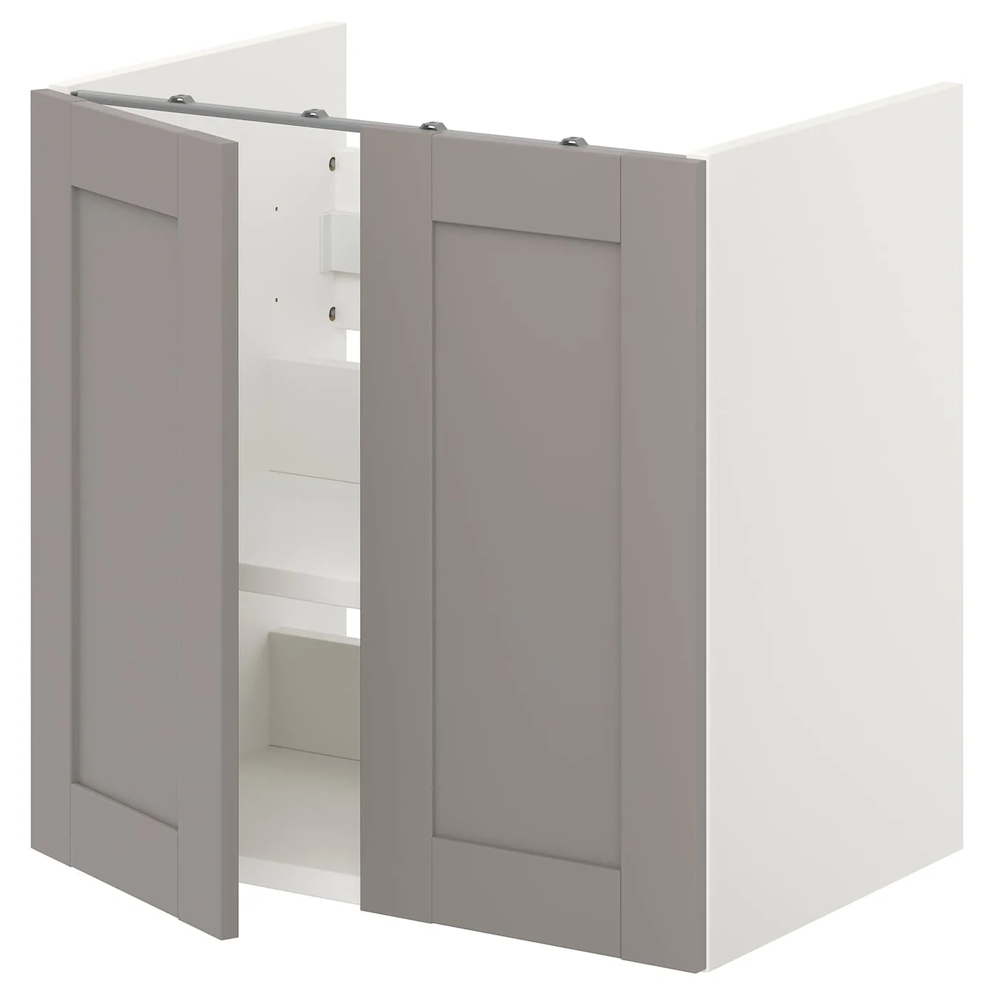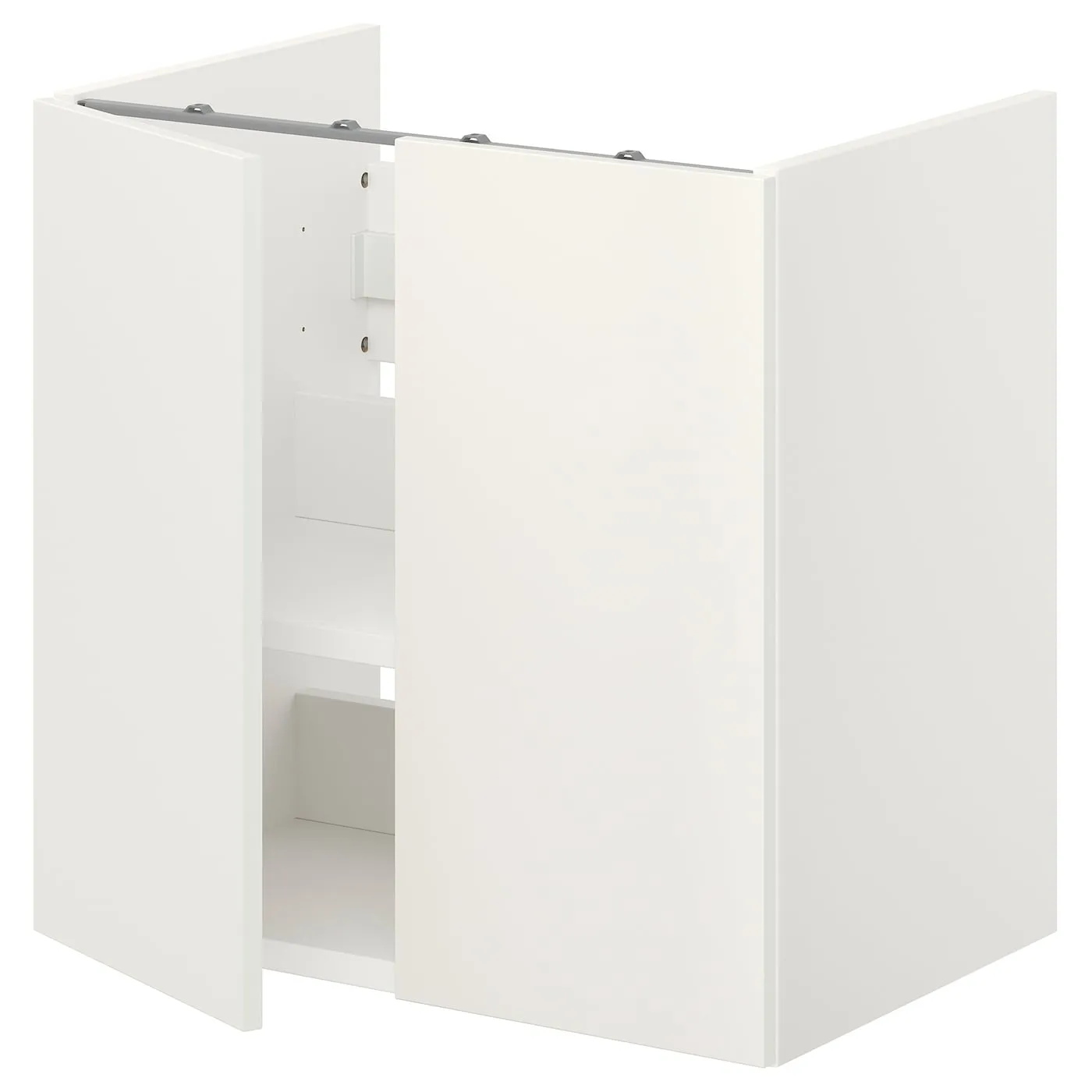 Серия ENHET позволяет легко создать новое решение для ванной комнаты. Этот шкафчик под раковину с полкой удобно хранит полотенца и туалетную бумагу, а белые дверцы добавляют свет в помещение.