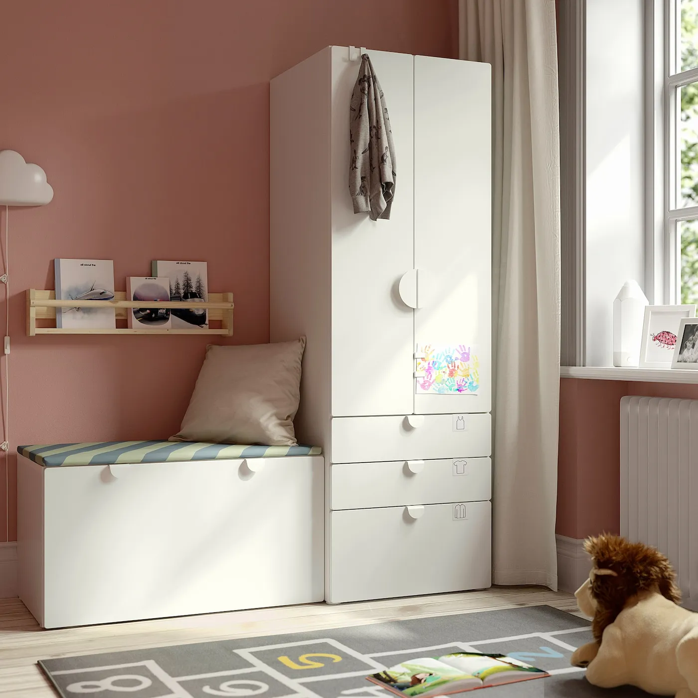 Эта универсальная система хранения легко адаптируется, по мере того как ваш ребенок растет и у него появляются новые потребности. Здесь достаточно места для одежды, ящики для мелких и крупных вещей и скамья, где можно уютно устроиться с книгой.