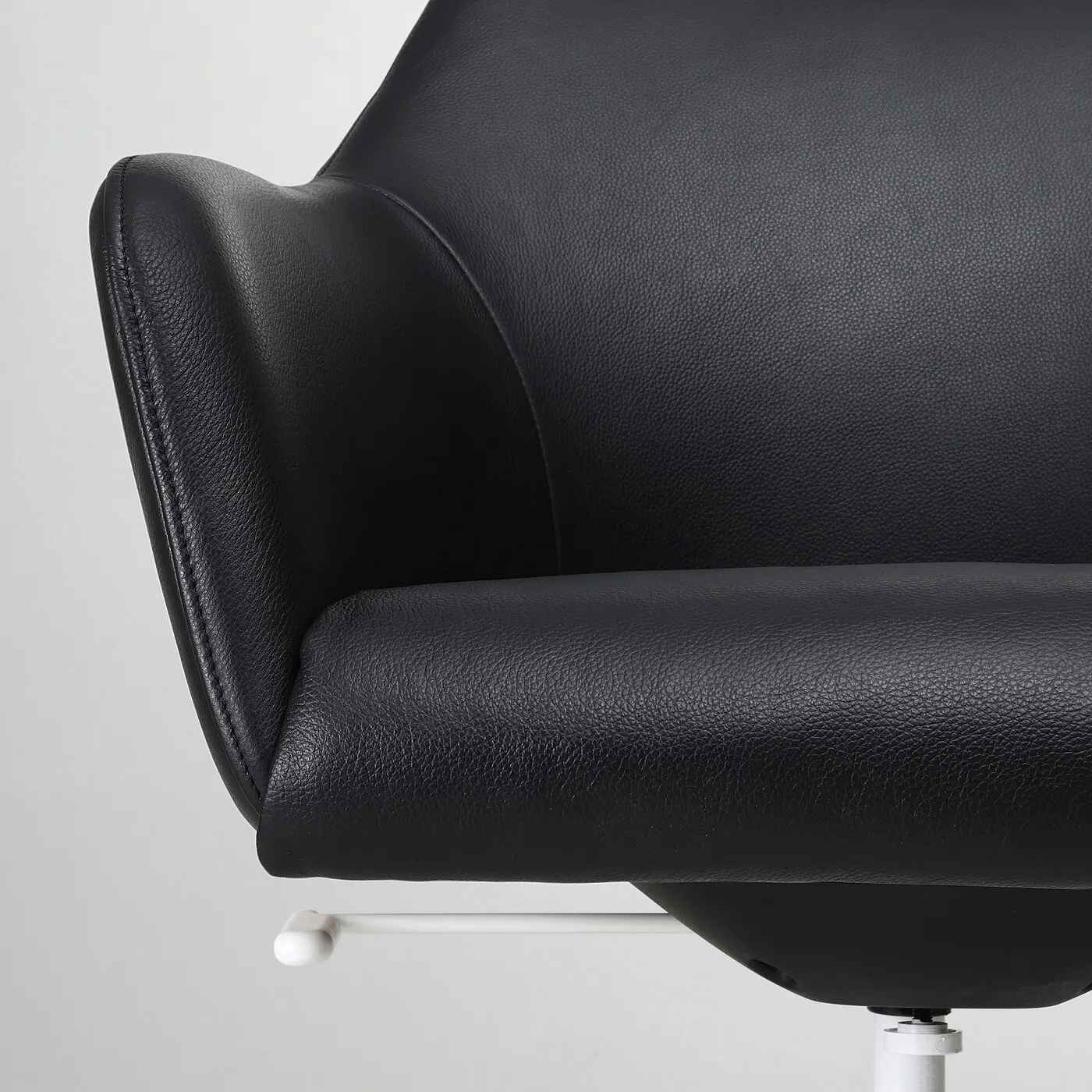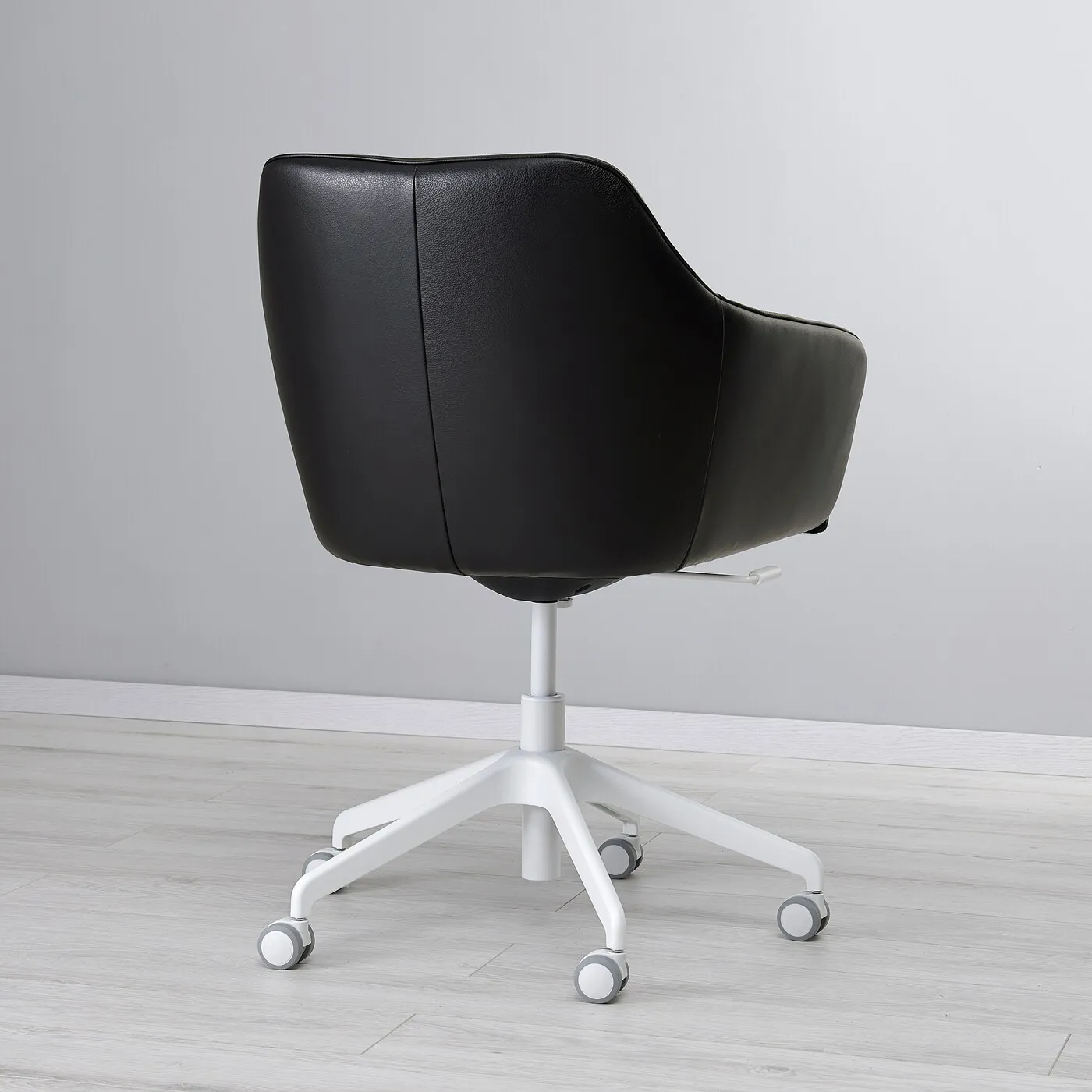 Кресло на колесиках с мягкими формами и приятной обивкой. Отделано прочной кожей, которая гармонично вписывается в любой интерьер — и колесиками, которые облегчают перемещение.