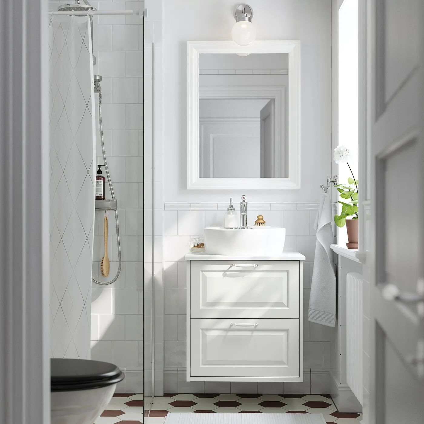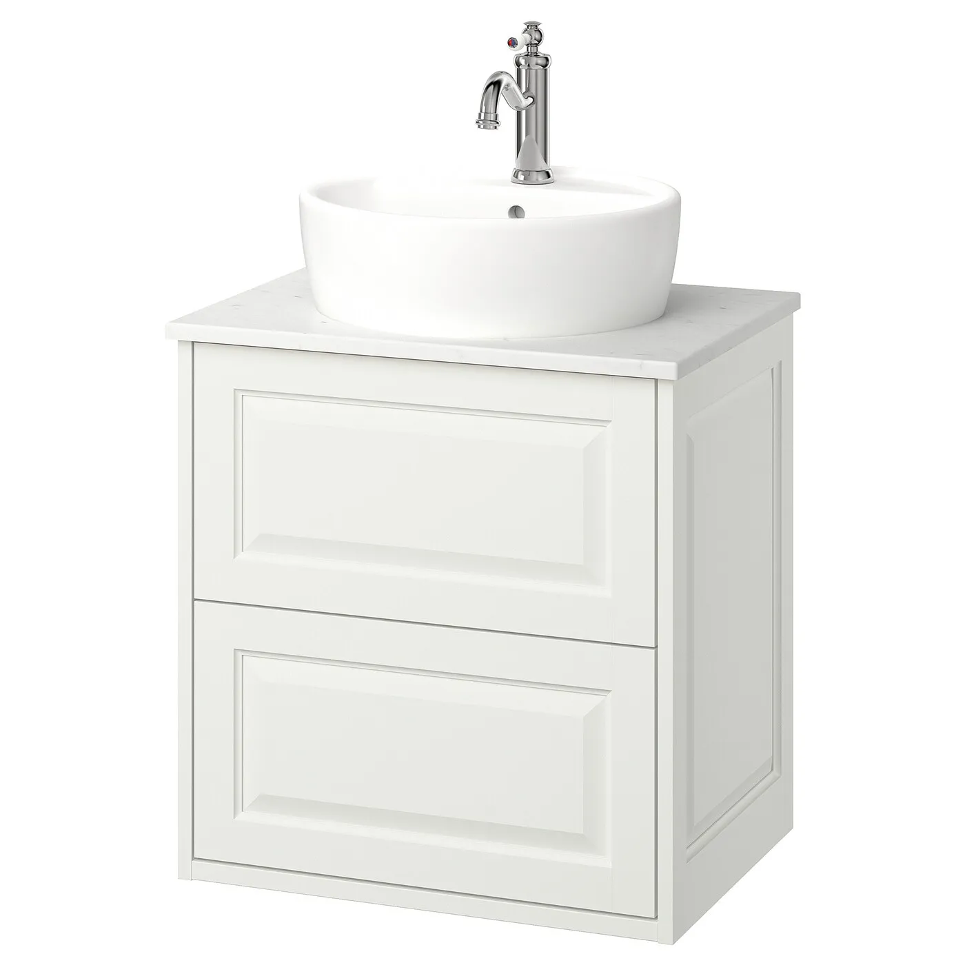Мебель для ванной TÄNNFORSEN подчёркивает классическую элегантность благодаря скосам по краям. Эта тумба с круглой столешницей и раковиной создаёт в ванной особую атмосферу.
