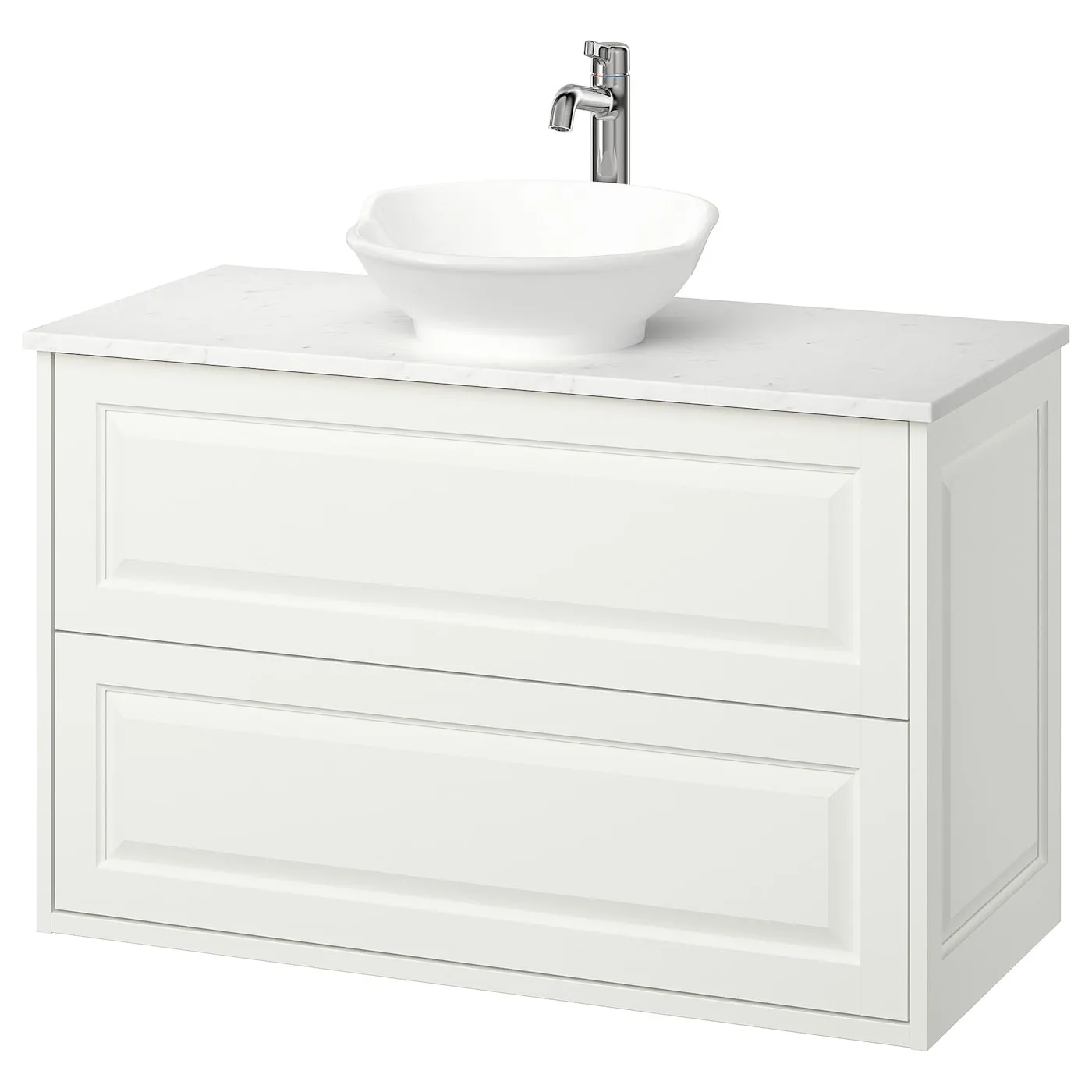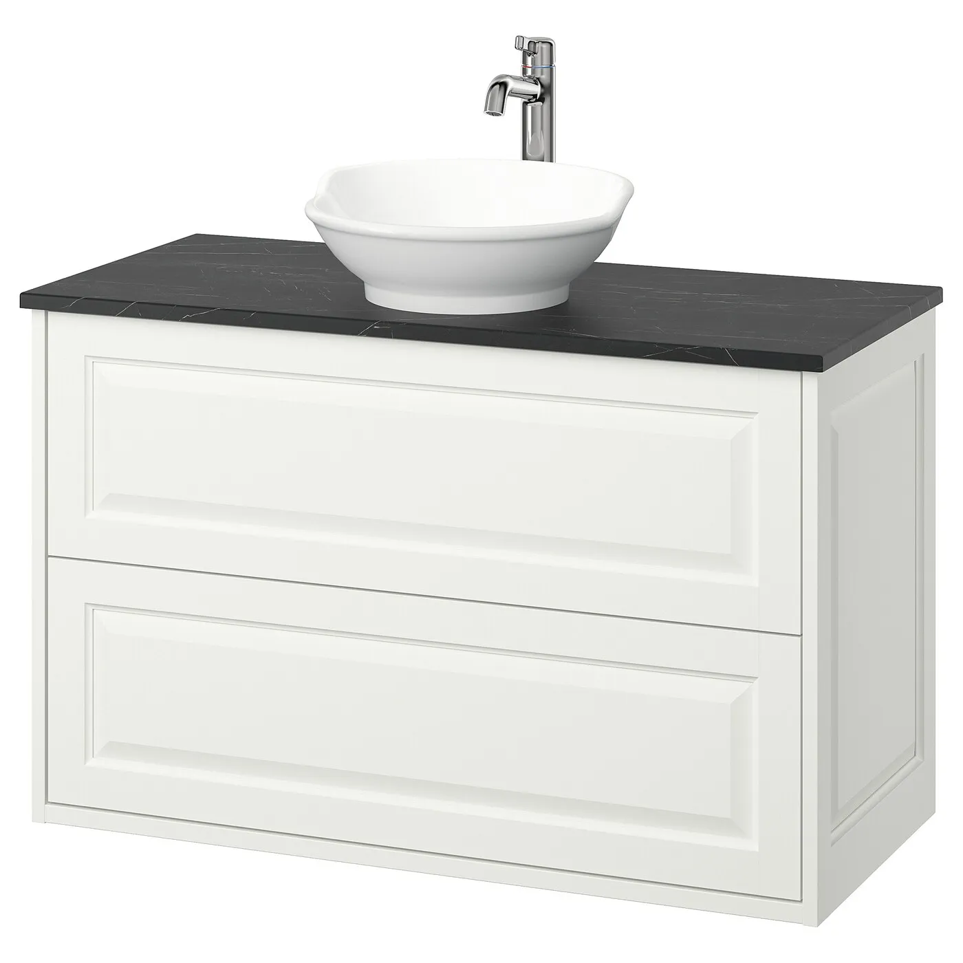 Мебель для ванной TÄNNFORSEN выражает классическую элегантность с изящной фрезеровкой. Эта комбинация с верхней панелью и круглой раковиной с приподнятой задней частью становится красивым акцентом с изысканным видом.