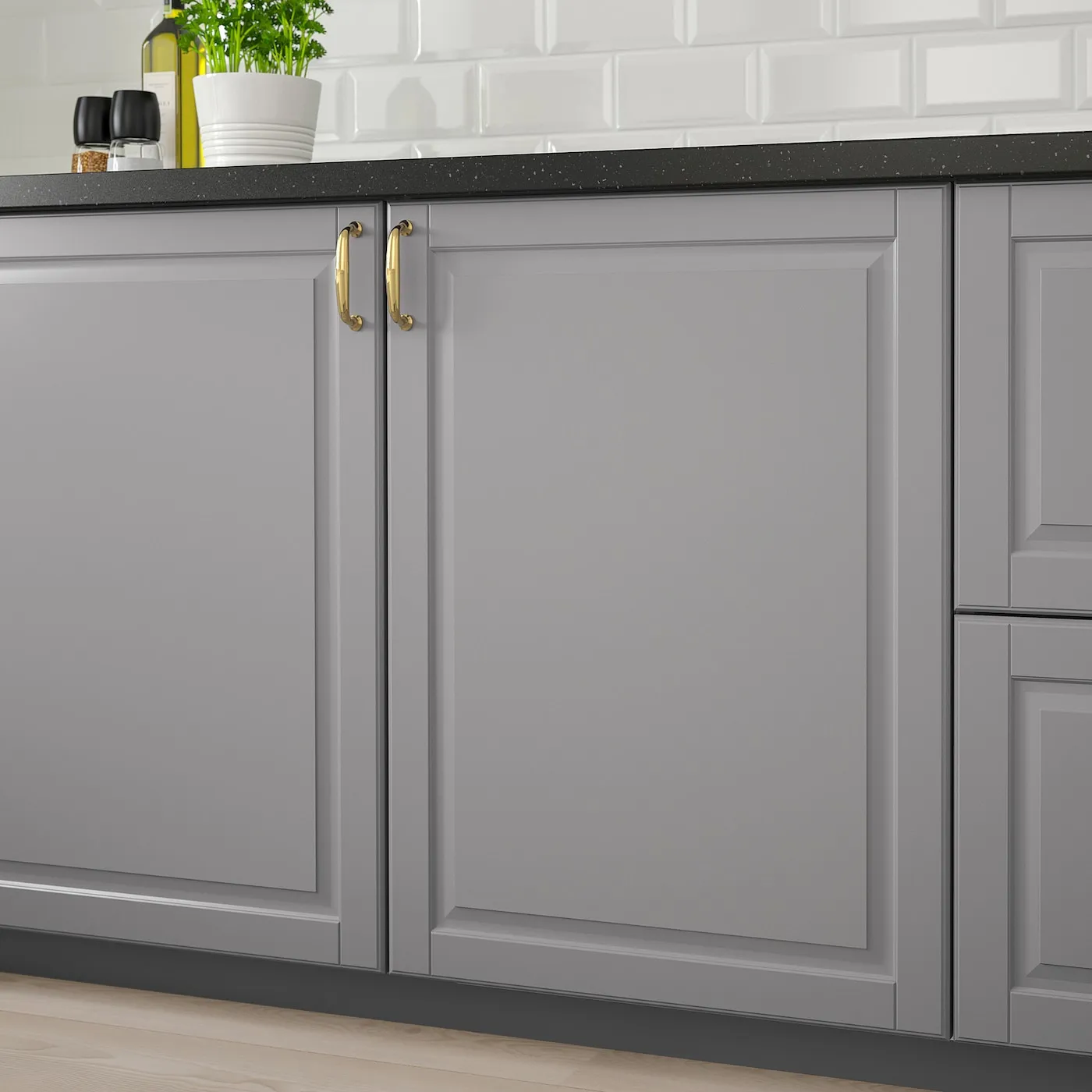 Дверь BODBYN имеет рамку и фаску, что придаёт ей выразительный традиционный характер. Мягкий серый цвет добавляет изысканности в интерьер вашей кухни.