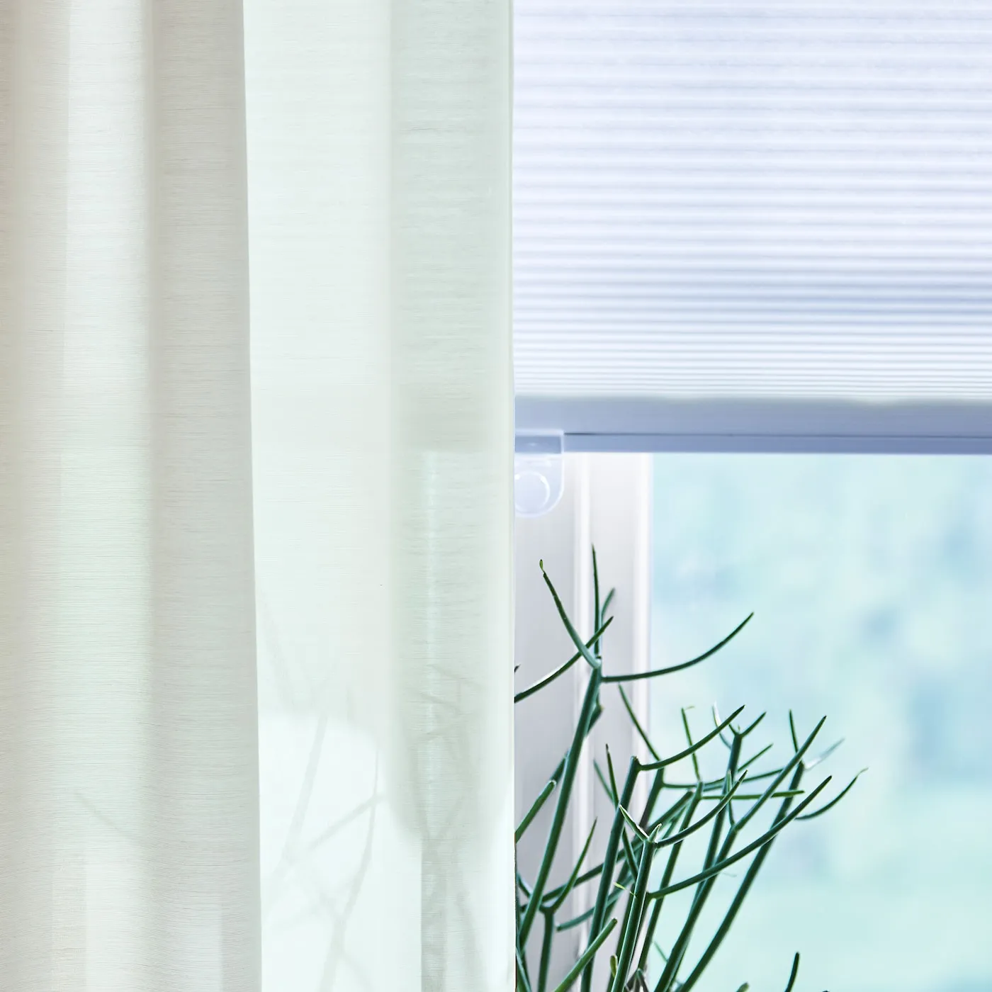 Опустите штору до нужного уровня, чтобы сохранить уединенность и защититься от яркого солнца. Свет, проходя через белую штору, мягко рассеивается, создавая уютную атмосферу в комнате.