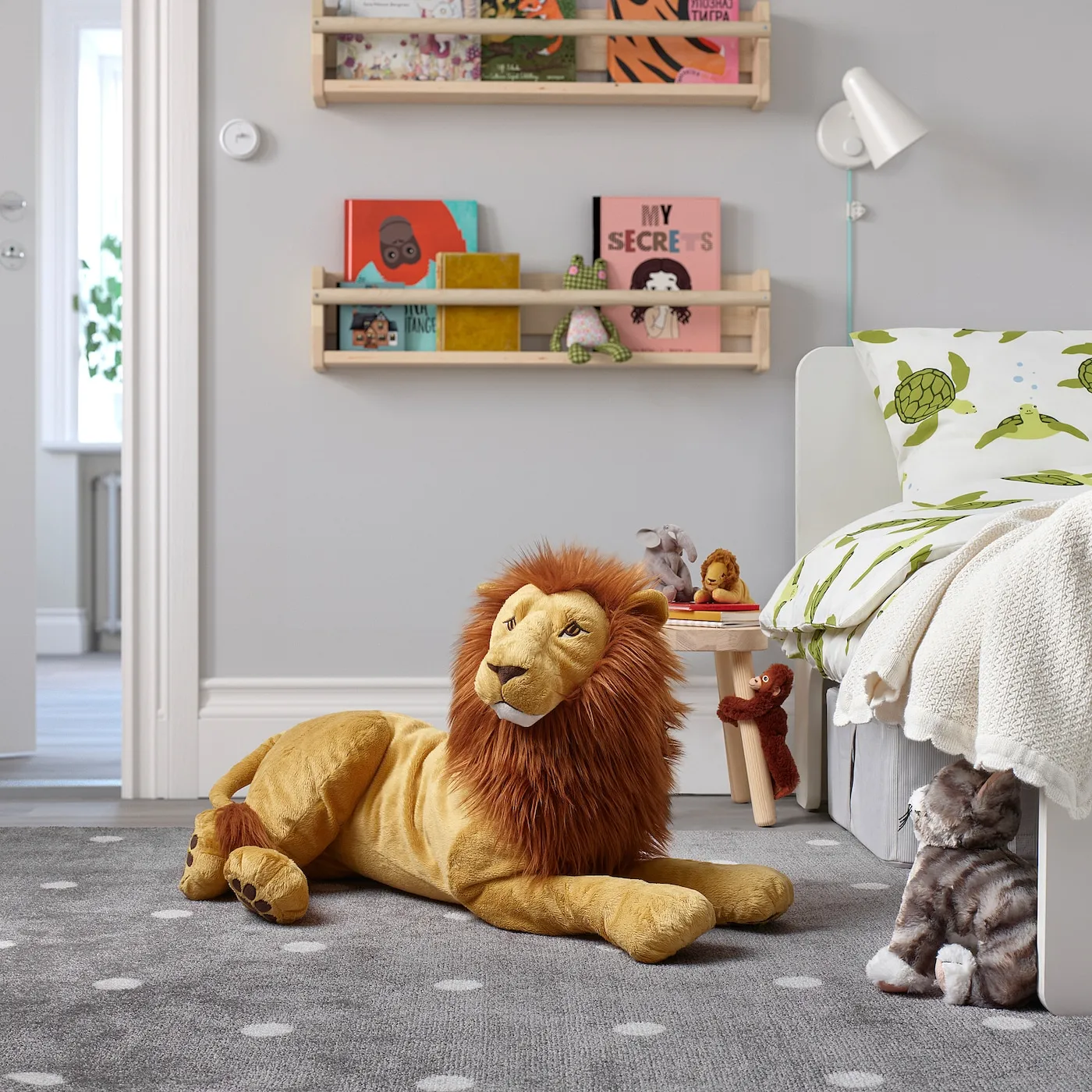 Лев — вторая по величине разновидность крупных кошек в мире, которую легко узнать по пышной гриве. Эта уютная мягкая игрушка тоже большая и отлично подходит для объятий и утешения, когда вашему ребенку страшно или он устал.