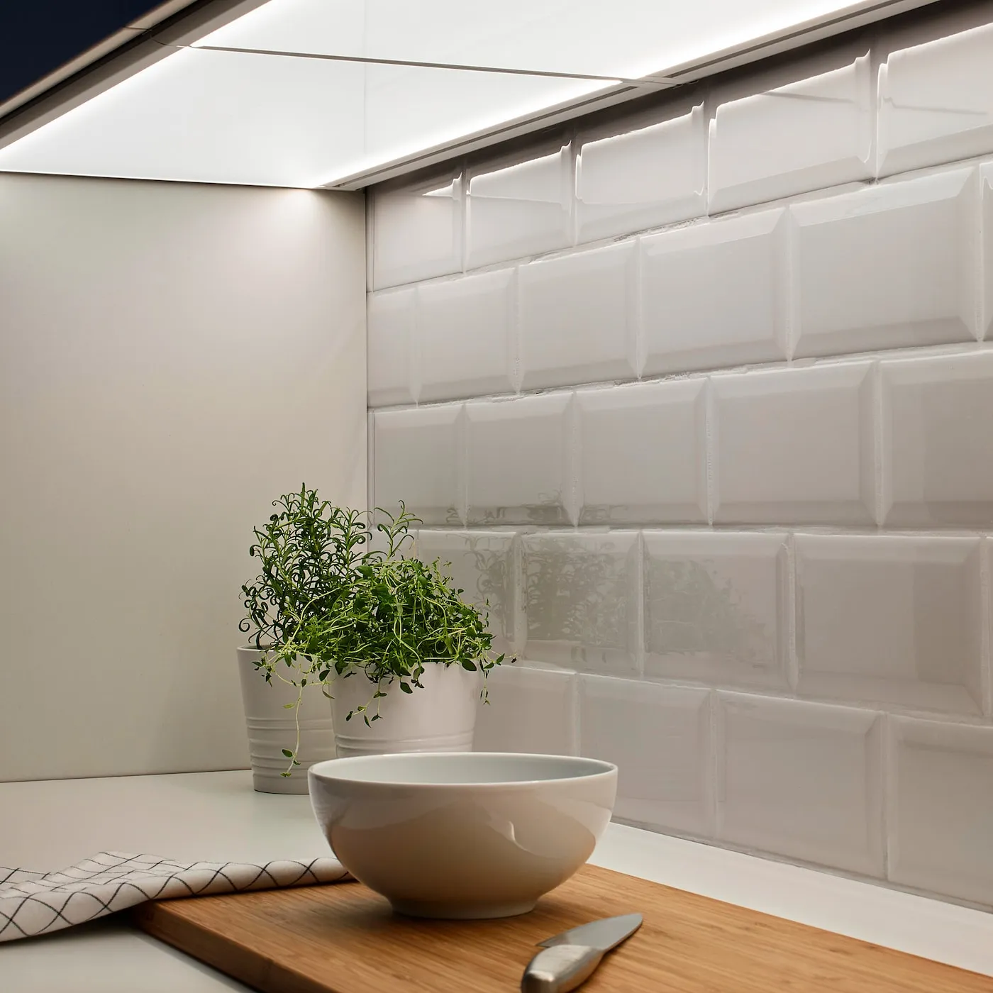 Панель закрывает низ навесного шкафа и равномерно освещает рабочую поверхность без теней. Современный дизайн, который создает атмосферу и облегчает кухонные дела.