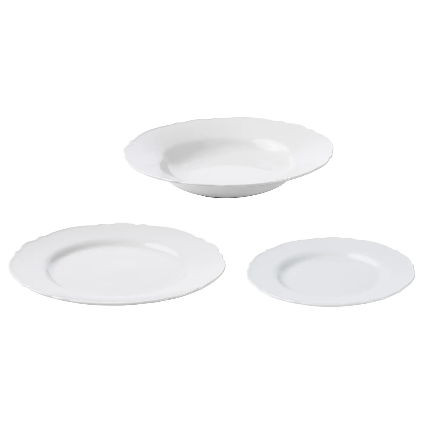 В комплекте: тарелка (28 см), глубокая тарелка (26 см) и небольшая тарелка (22 см), по 6 каждого типа.