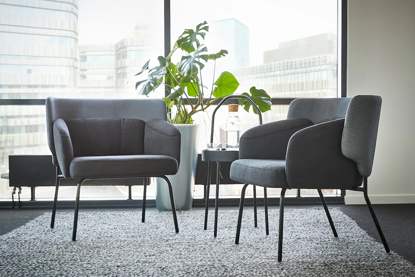 Изогнутая и обволакивающая спинка кресла BINGSTA позволяет окунуться в уединение даже в открытом пространстве.