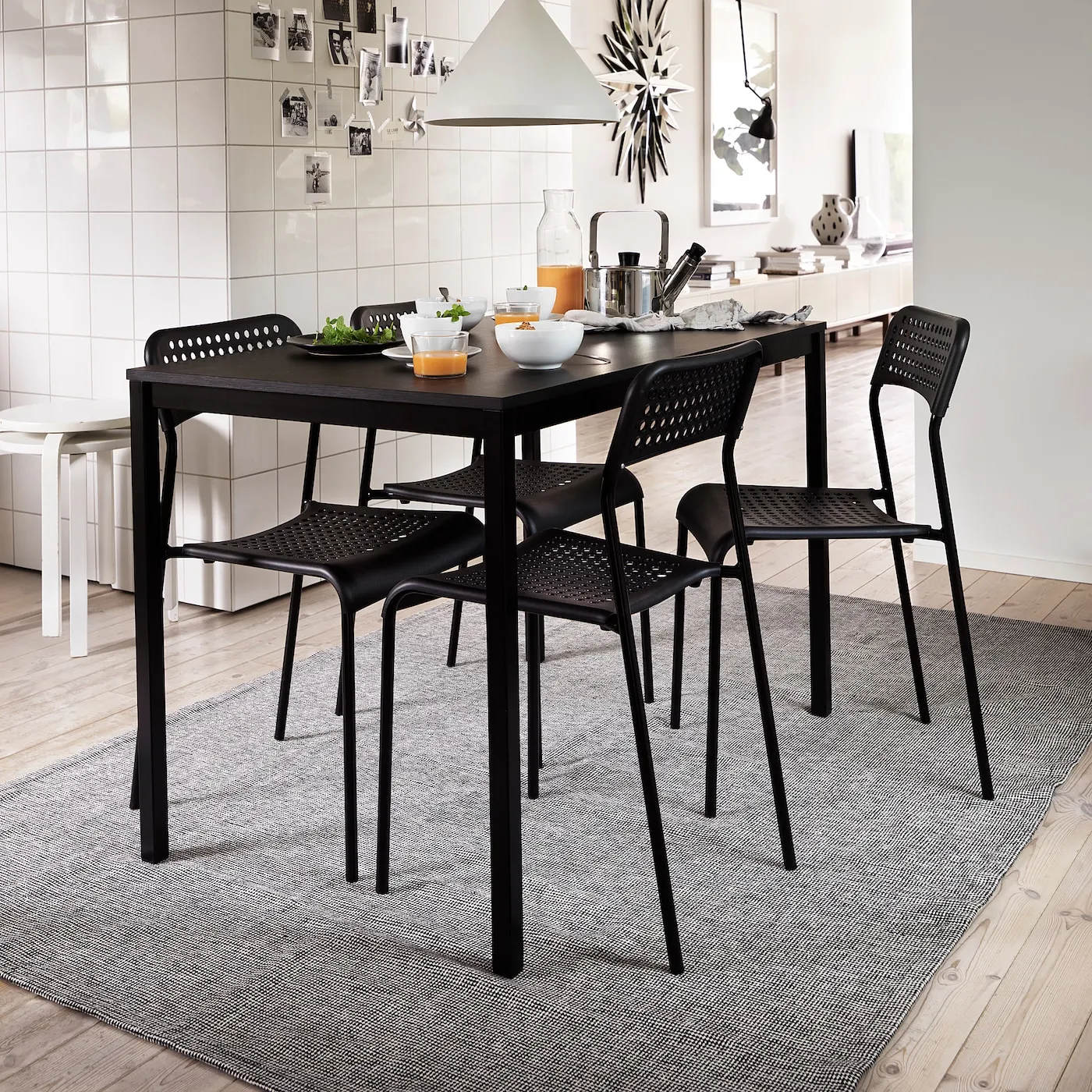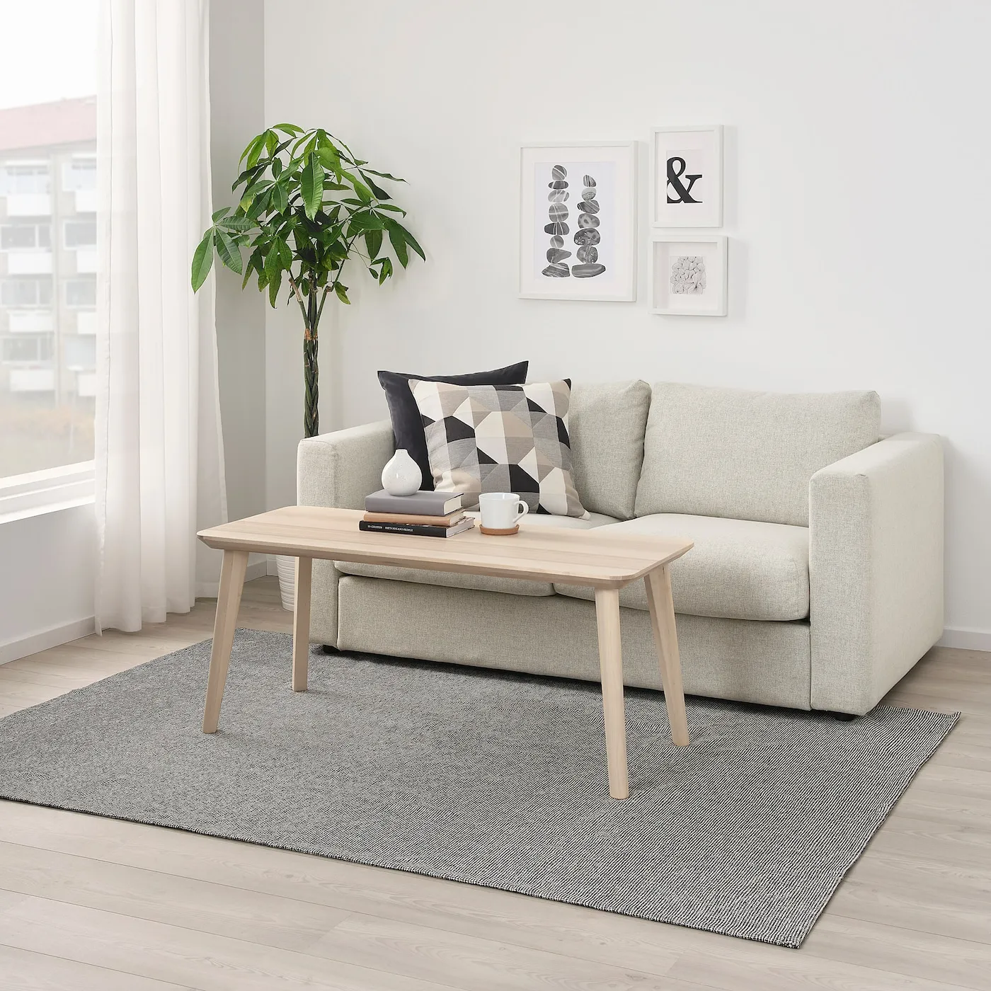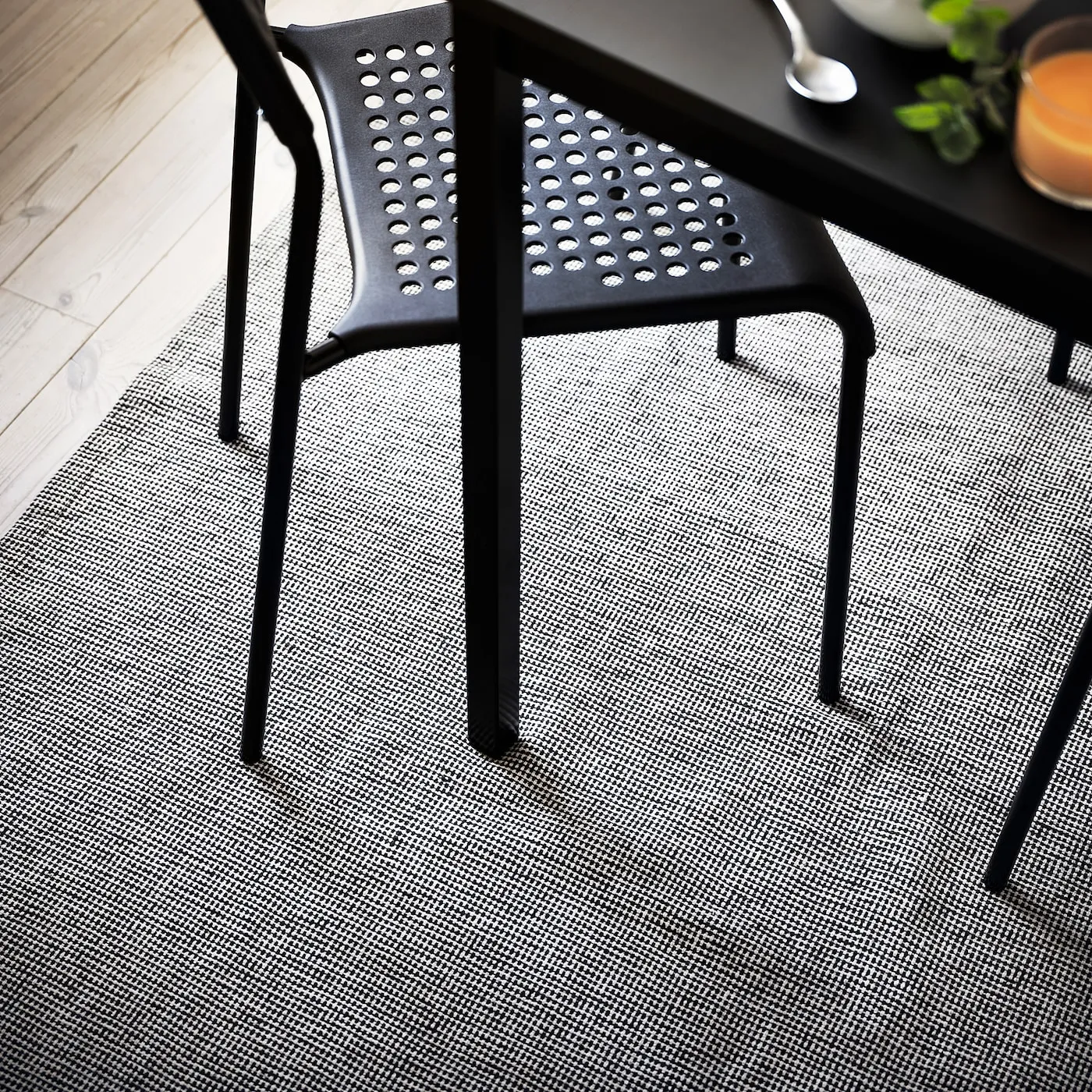 Подходит для использования в гостиной или под обеденным столом благодаря плетёной поверхности, которая облегчает перемещение стульев и уборку.