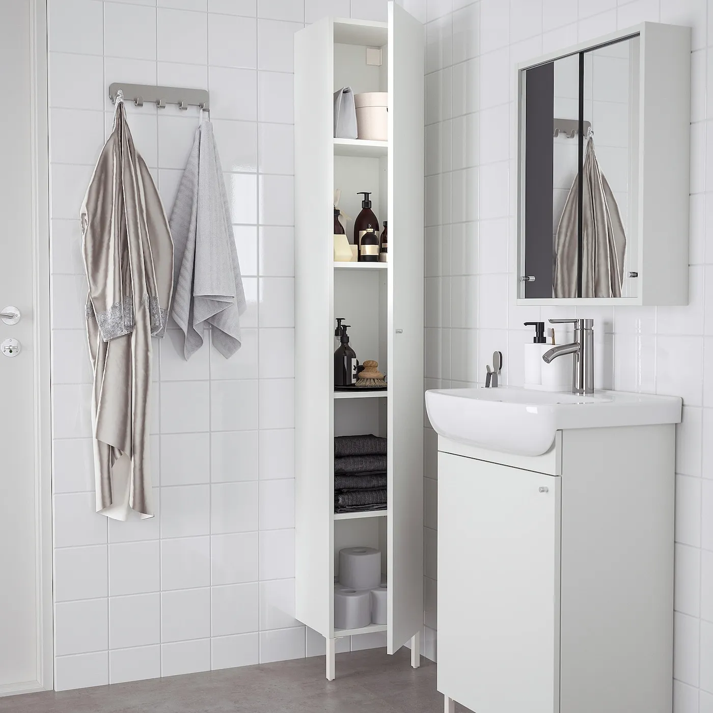 Этот высокий шкаф предоставляет обилие места для хранения всех необходимых вещей, не занимая много площади. Установите дверь так, чтобы она открывалась влево или вправо — как вам удобнее для вашей ванной комнаты.