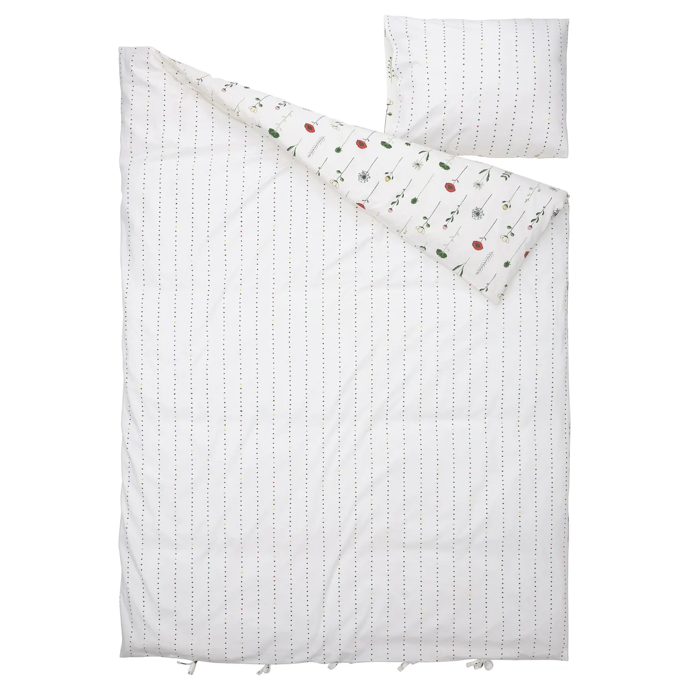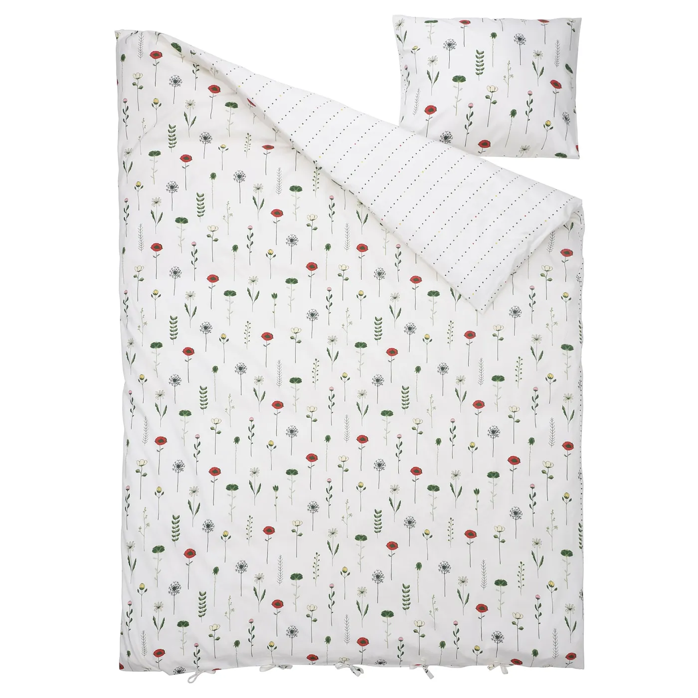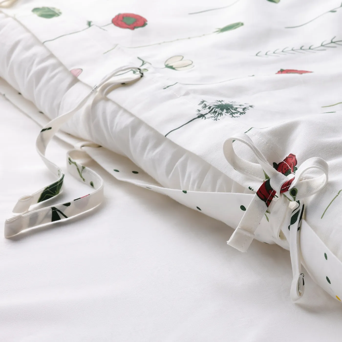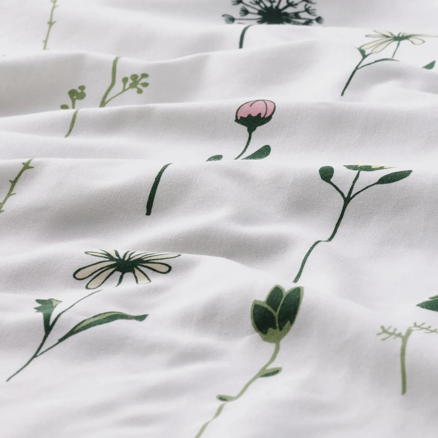 На одной стороне пододеяльник украшен летними цветами на крепких стеблях, а на другой — разбросанные ряды темно-зеленого горошка.