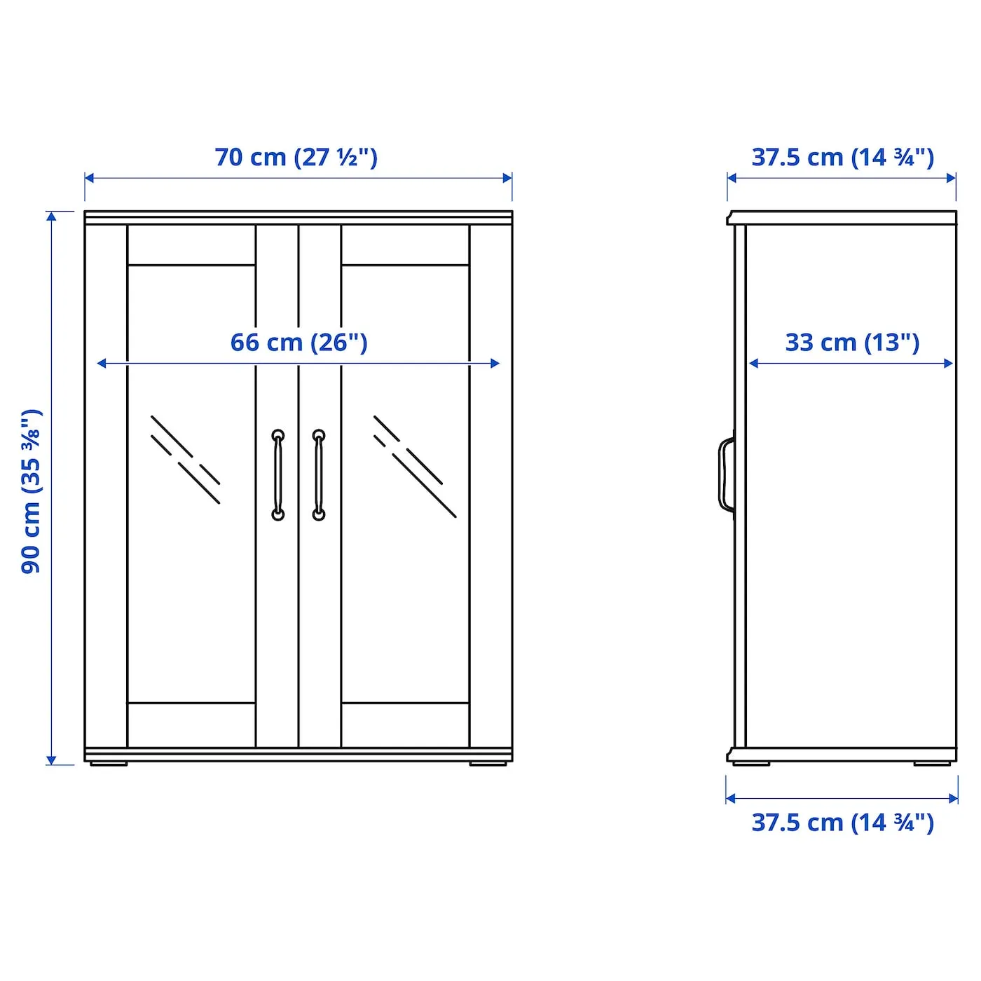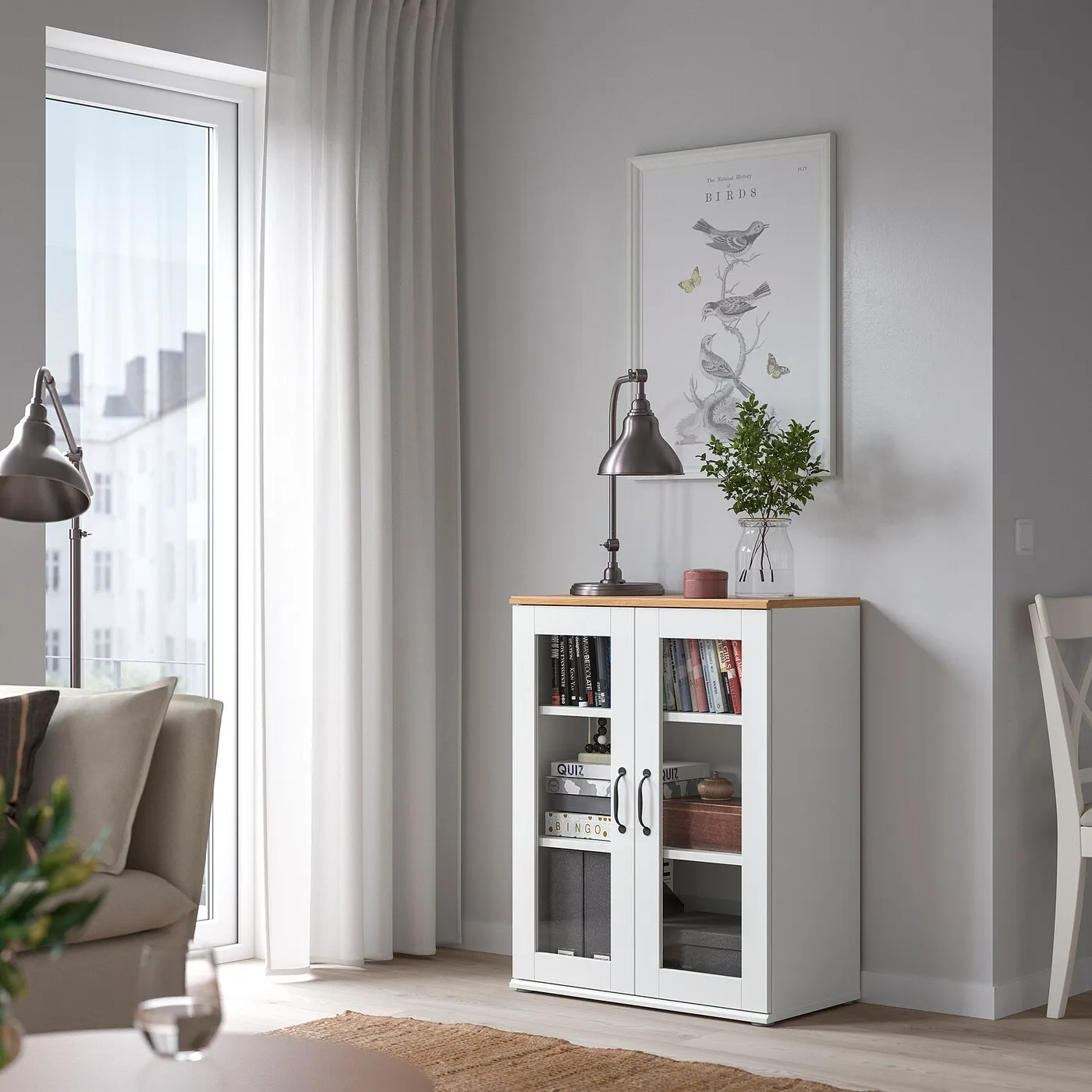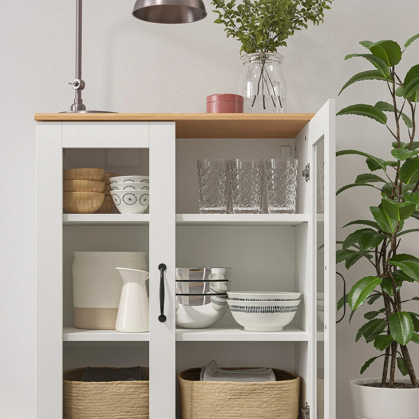 Серия SKRUVBY отличается традиционным стилем и предоставляет множество автономных элементов для хранения, которые можно сочетать как угодно. Верхняя панель шкафа со стеклянными дверцами выполнена под теплый дуб, что отлично подходит для предметов, которые вы хотите выставить на показ.