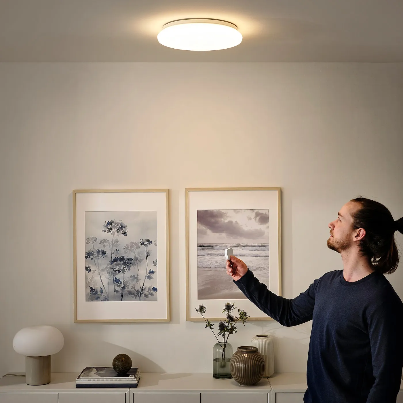 Эта большая лампа излучает теплый белый свет, который можно беспроводно регулировать, если использовать устройство управления. Отлично подходит для помещений, где нужно много света, например, кухни или гостиной.