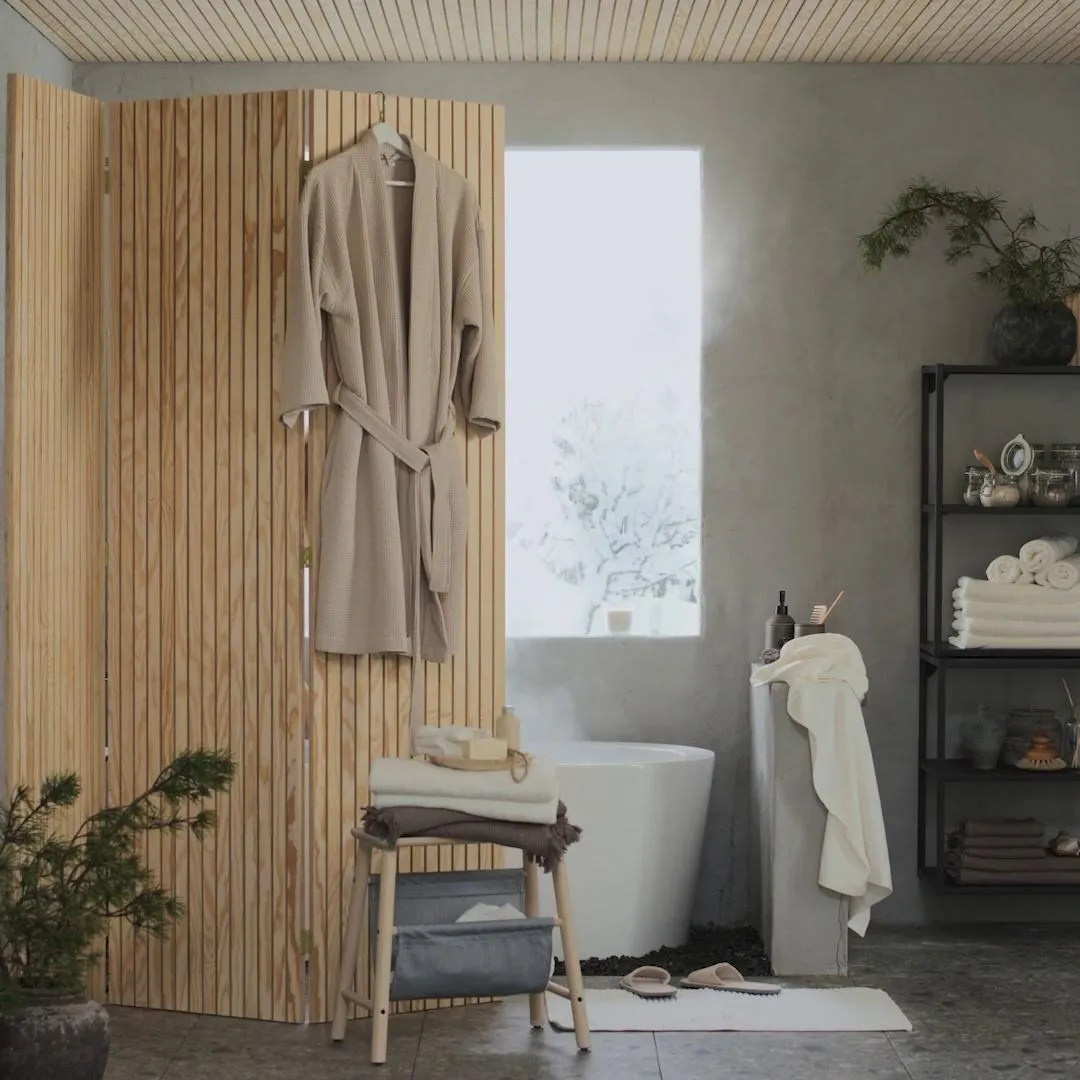 Идеально подходит после душа, поскольку смесь хлопка и вискозы с вафельной текстурой хорошо впитывает влагу и быстро сохнет.