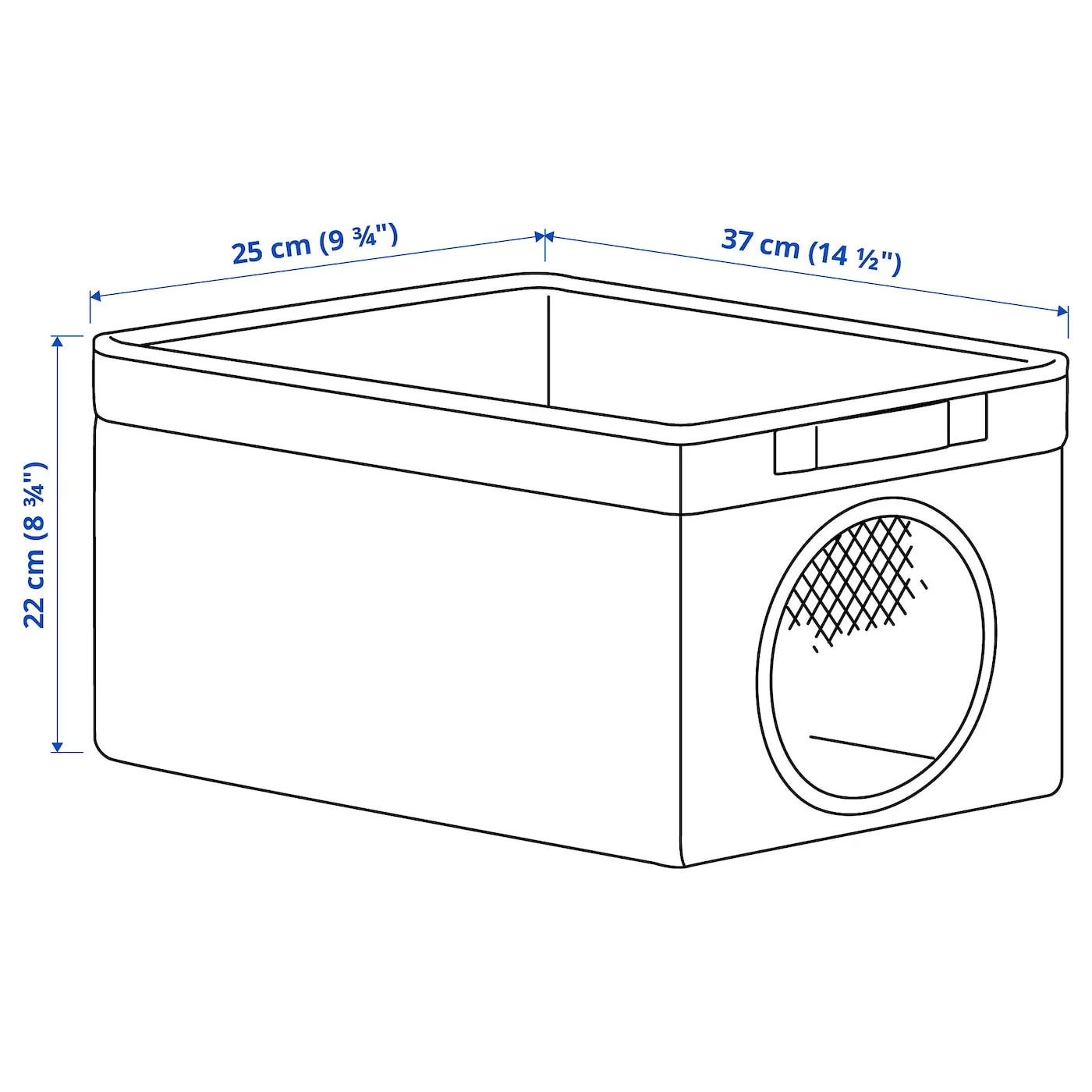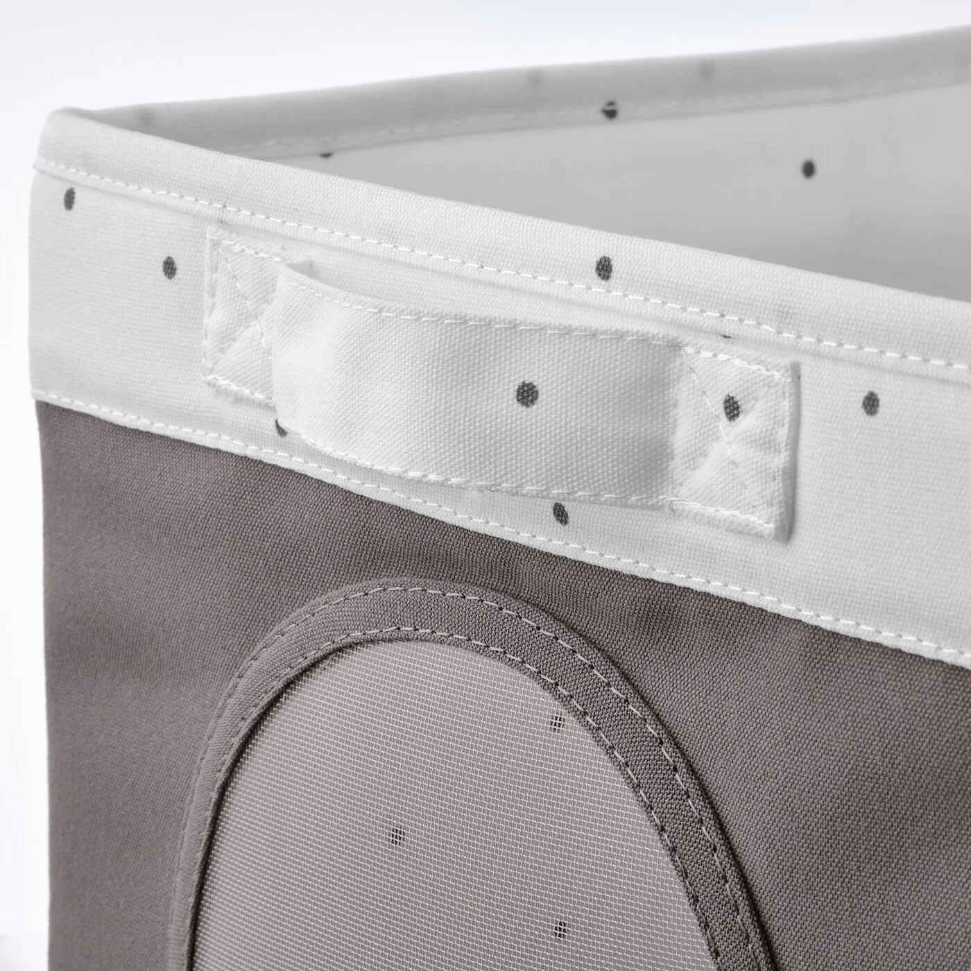 Удобная коробка с ручкой для хранения мелочей или одежды для вашего малыша. Сквозь сетчатое окошко можно видеть содержимое. Изготовлена из переработанного полиэстера в серых тонах, которые подходят ко всем цветам и стилям.