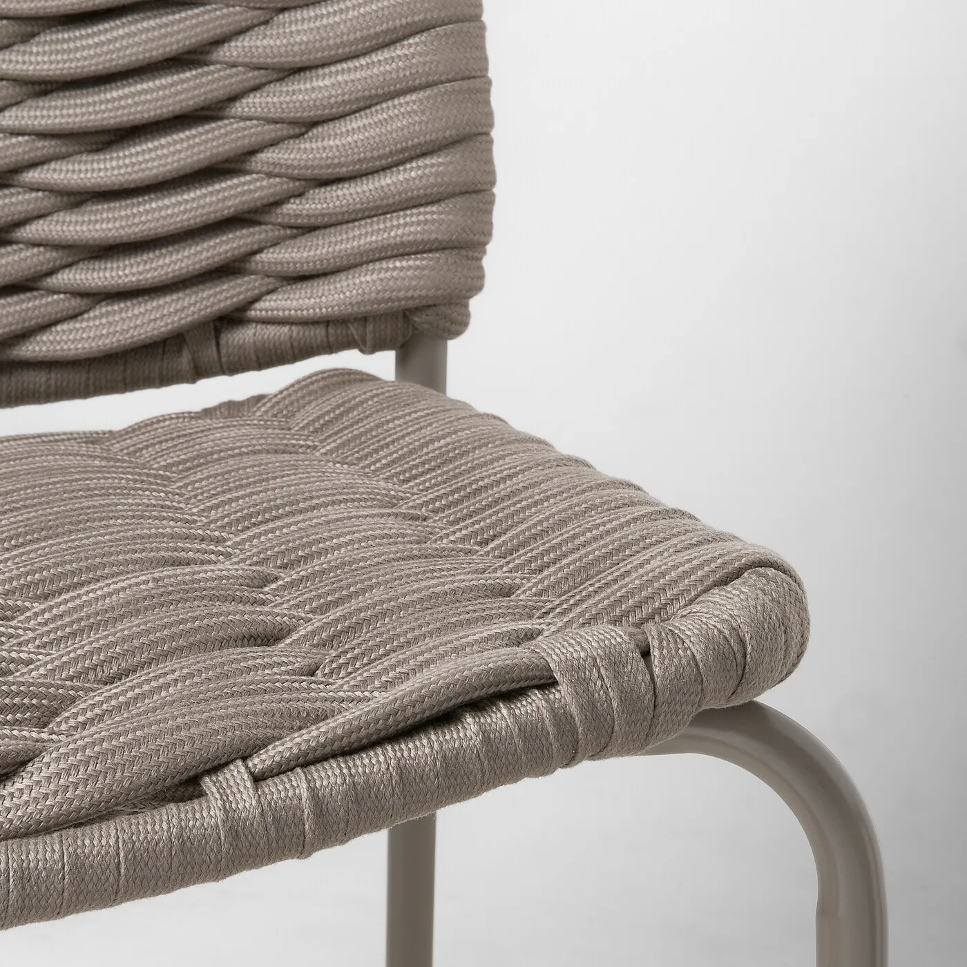 Плетёное и гибкое текстильное сиденье придаёт стулу элегантный вид и делает его подходящим как для использования внутри, так и снаружи.