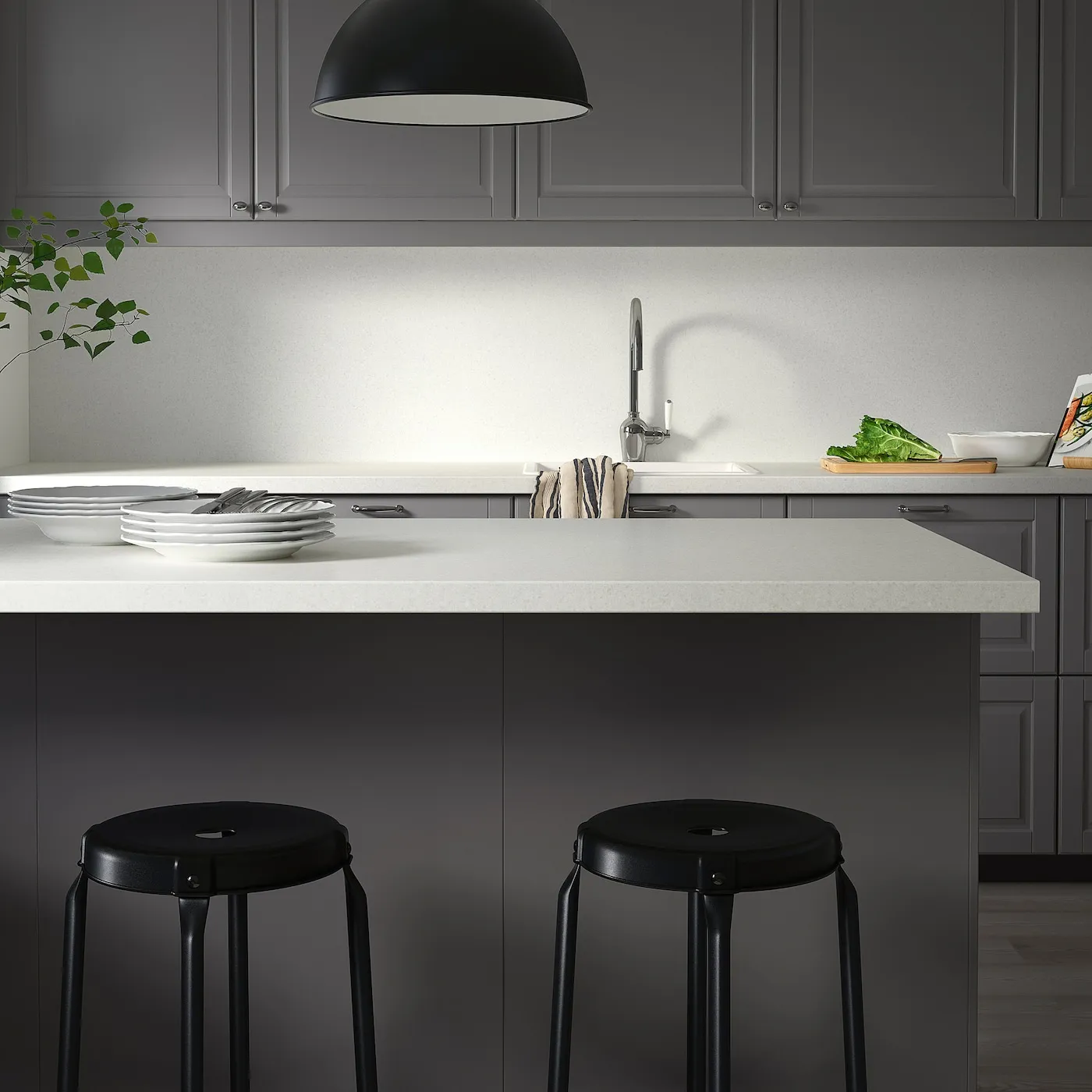 Столешница SÄLJAN с закругленными краями предлагает прочное лаковое покрытие, которое сохраняет свою красоту с течением времени. Нейтральный рисунок светло-серого каменного эффекта на белом фоне легко сочетается с большинством фасадов кухонь.
