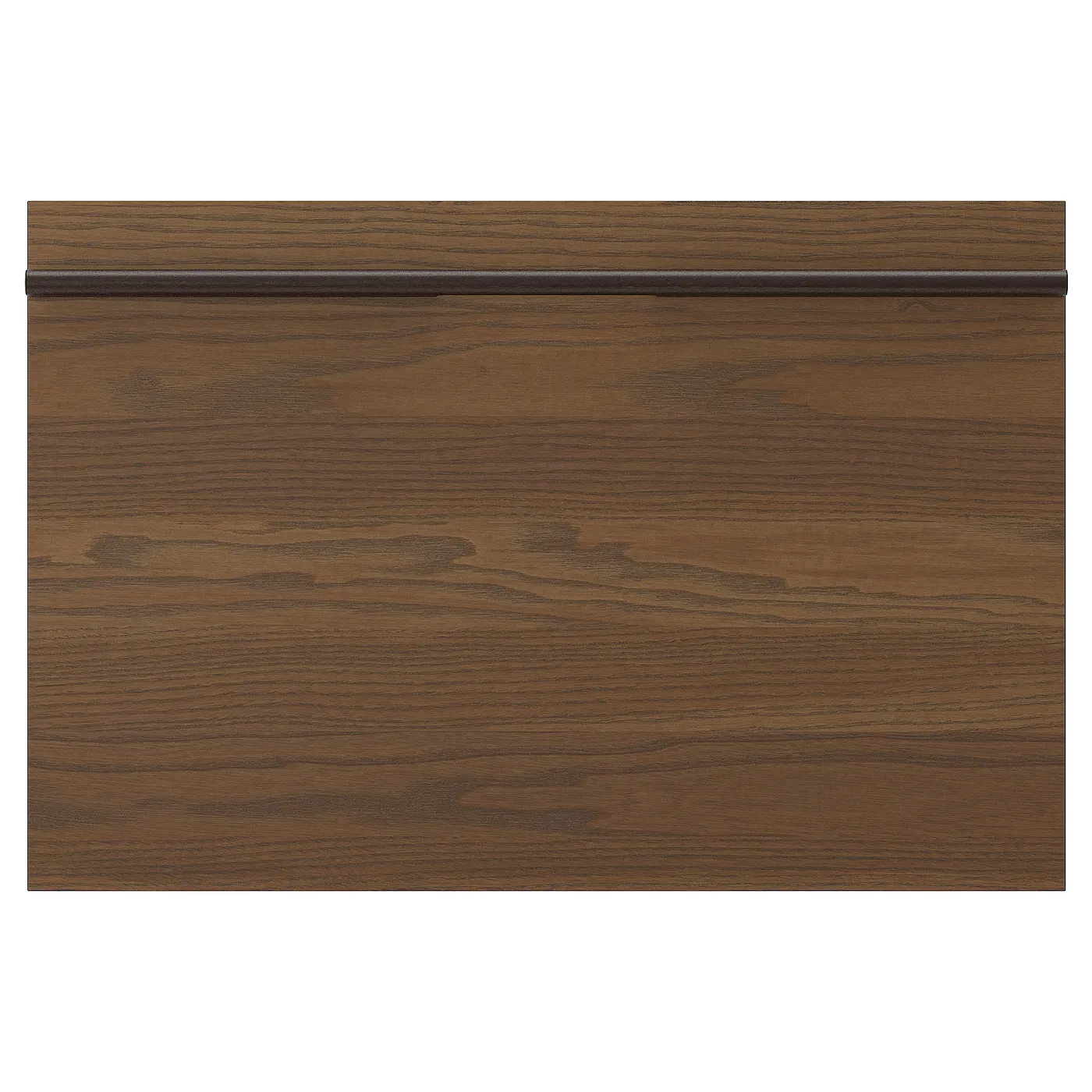 Фасады кухни STENSTA с темно-коричневым мореным шпоным ясеня имеют выразительный узор древесины, дополненный массивными деревянными ручками, проходящими по всей ширине фасада, чтобы подчеркнуть изящный линейный вид.