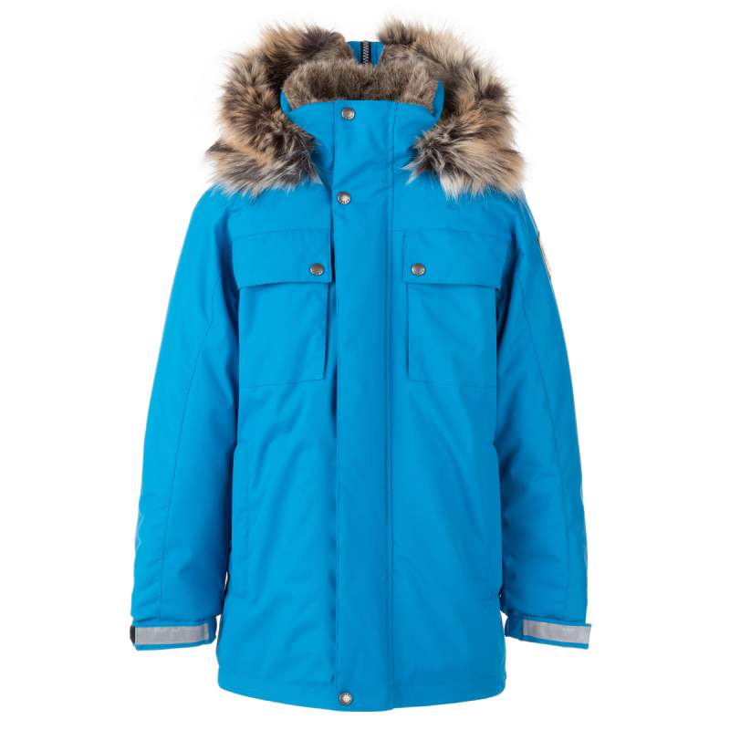 Главная особенность — капюшон с красивым искусственным мехом, который можно расстегнуть и превратить в высокий воротник. Куртка также оснащена регулируемыми манжетами, молнией с ветрозащитной планкой и светоотражающими элементами для безопасности.
