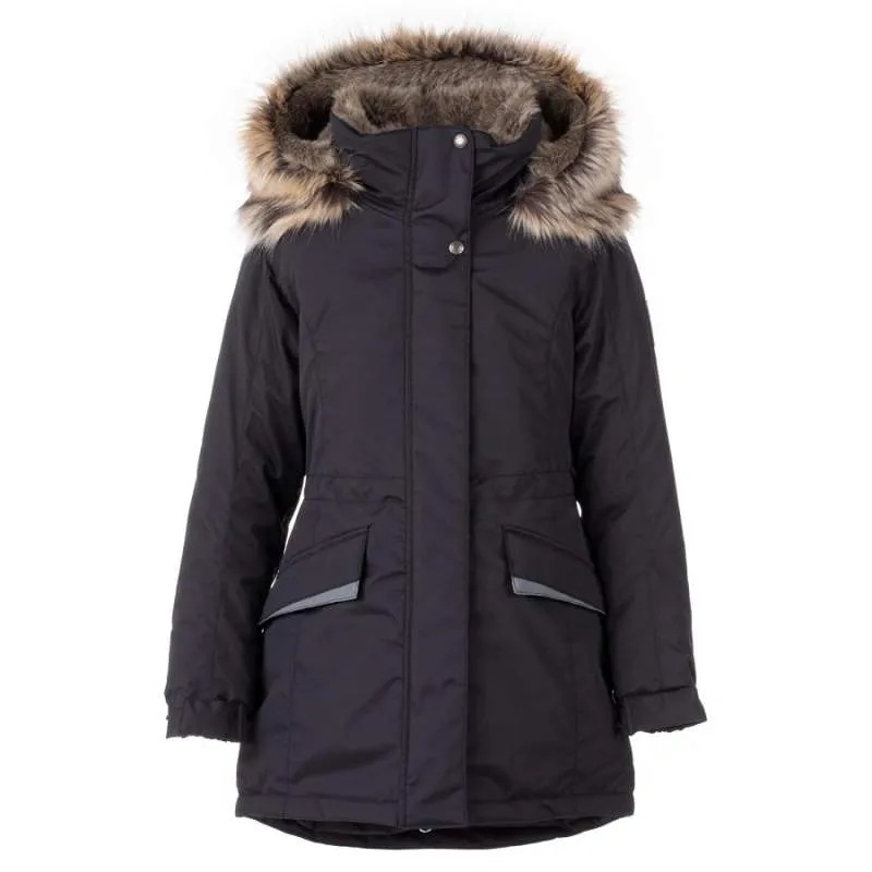 Капюшон полностью съёмный и украшен искусственным мехом, как и воротник. Есть два удобных кармана и петля для крепления светоотражателя.