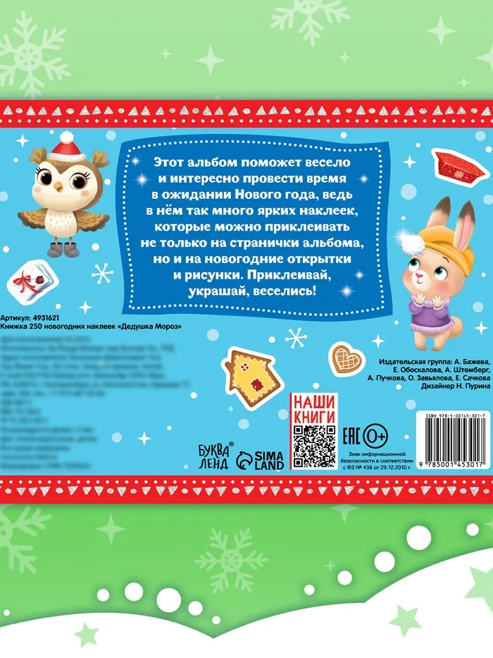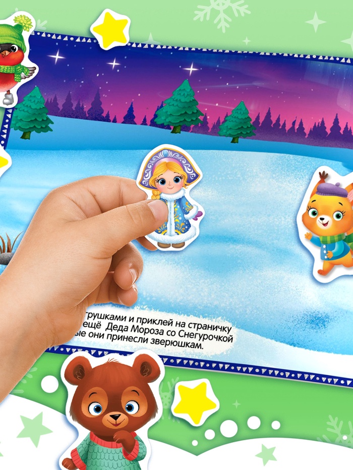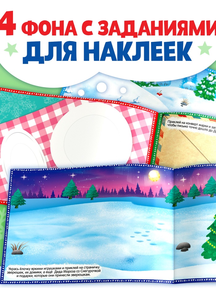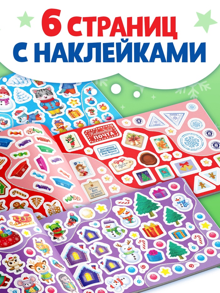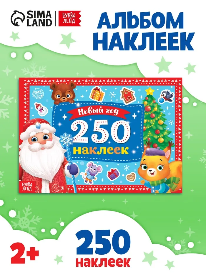Этот альбом поможет малышу весело и интересно провести время в ожидании Нового года — ведь в нём 250 ярких наклеек, которые можно приклеивать не только на странички альбома, но и на новогодние открытки и рисунки. Ребёнок будет украшать и веселиться!