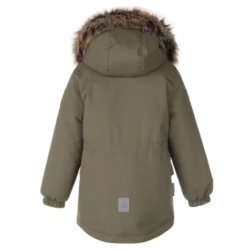 Капюшон съёмный, украшен искусственным мехом, который также можно снять. Манжеты рукавов на резинке, а основная молния прикрыта ветрозащитной планкой с кнопками. Светоотражающие элементы повышают безопасность ребёнка в тёмное время суток.