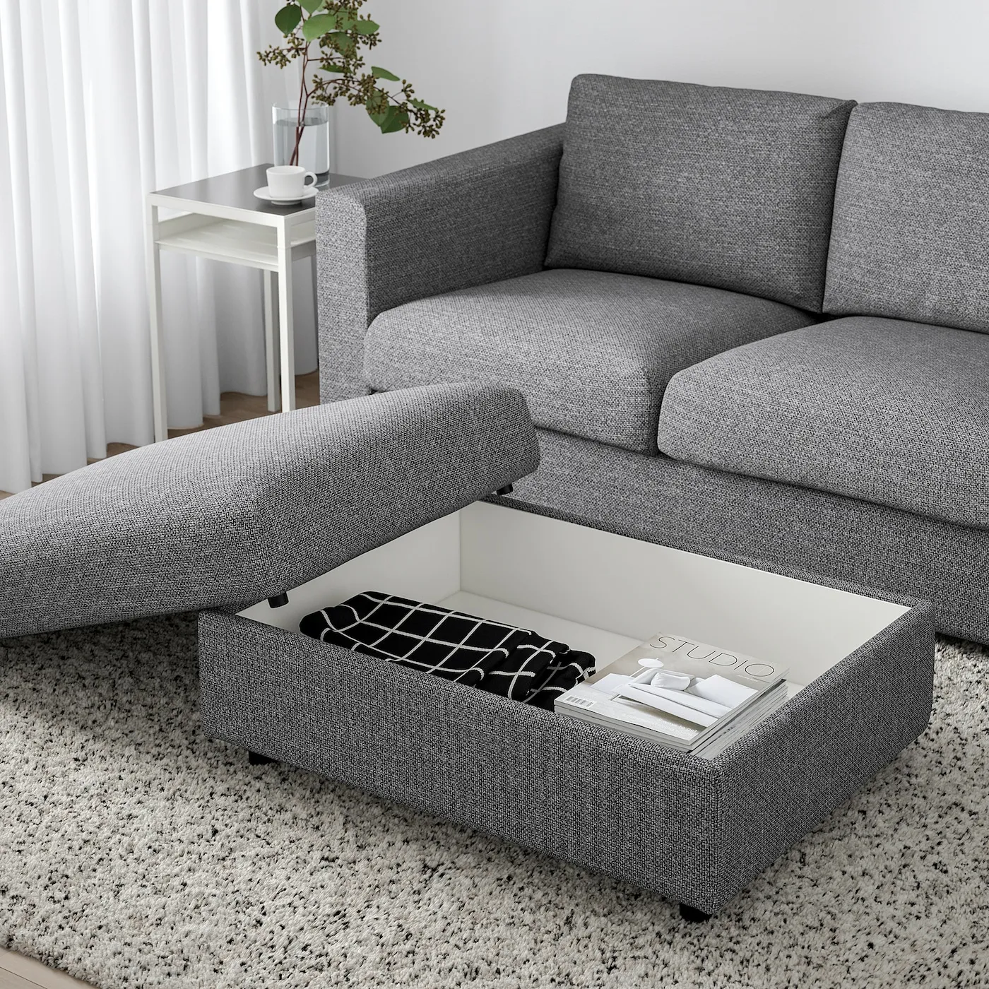VIMLE — это больше, чем просто пуф. На нём можно удобно разместить уставшие ноги, а скрытое пространство внутри поможет держать вещи в порядке — под рукой, но не на виду.