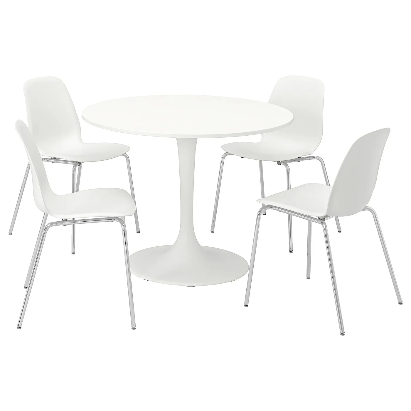 Практичный обеденный комплект для четверых, идеально подходящий для небольших помещений. Вы получаете чистый, современный вид и много удобства благодаря вогнутому сиденью и гибкой спинке стула.