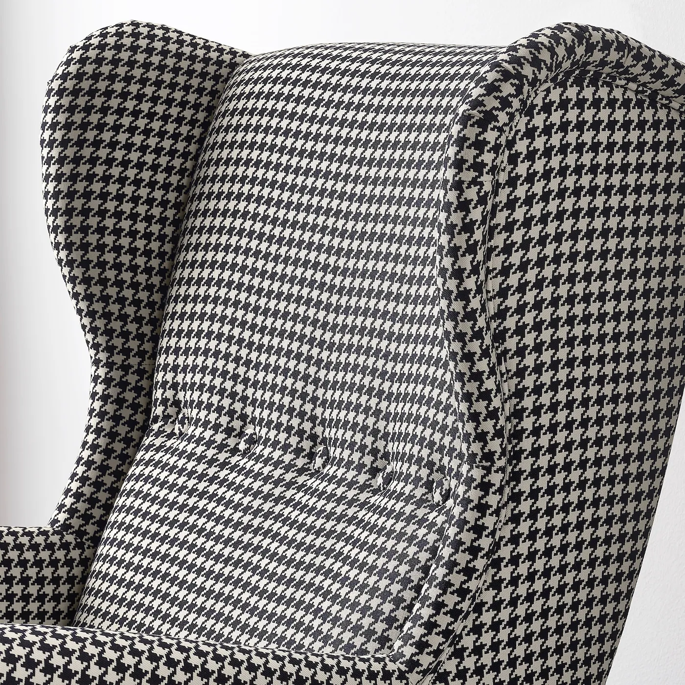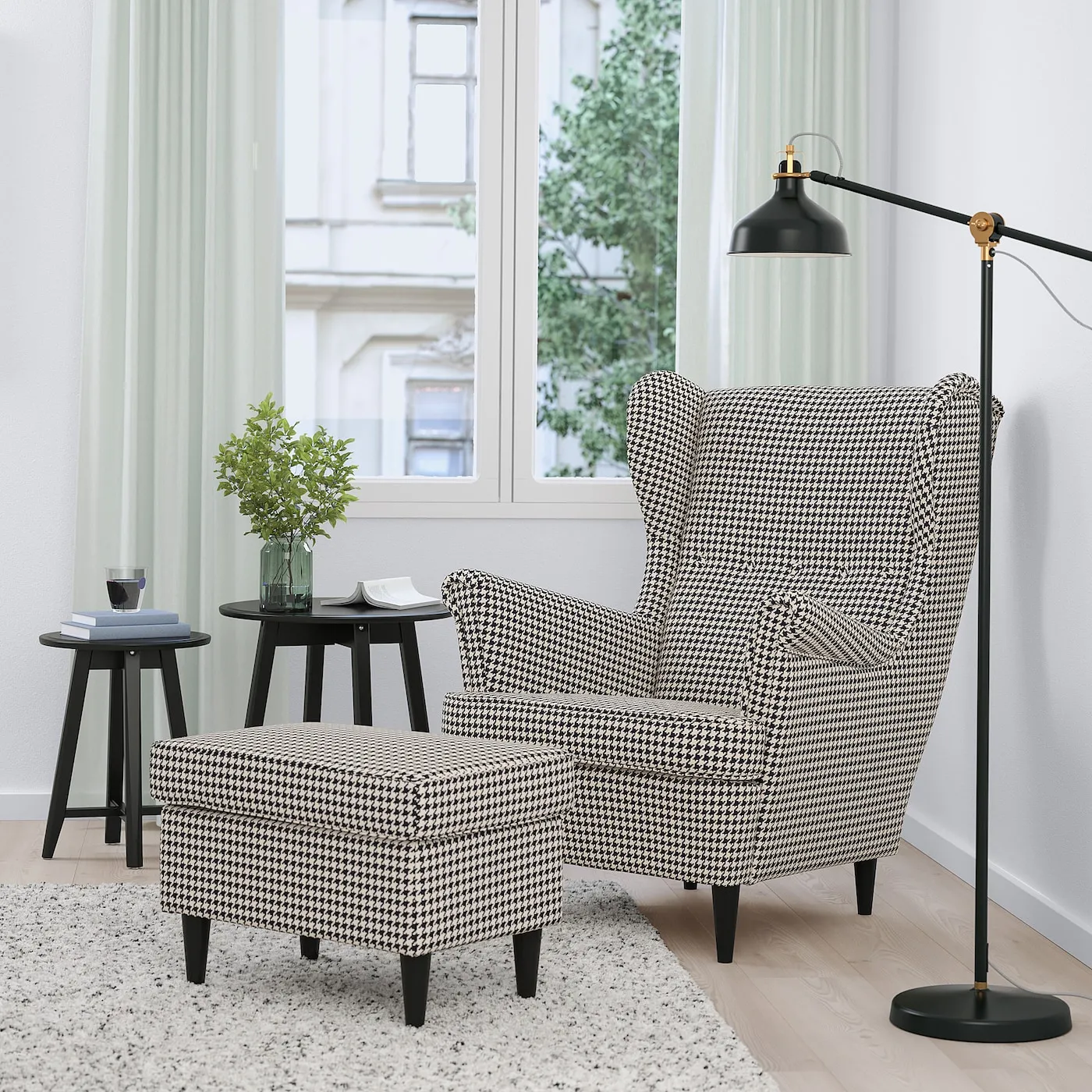 STRANDMON — это классический вид и современный комфорт для уютных моментов. Кресло с подлокотниками дает ощущение мягкого объятия, а пуф подходит как для отдыха ног, так и для дополнительных мест для гостей.