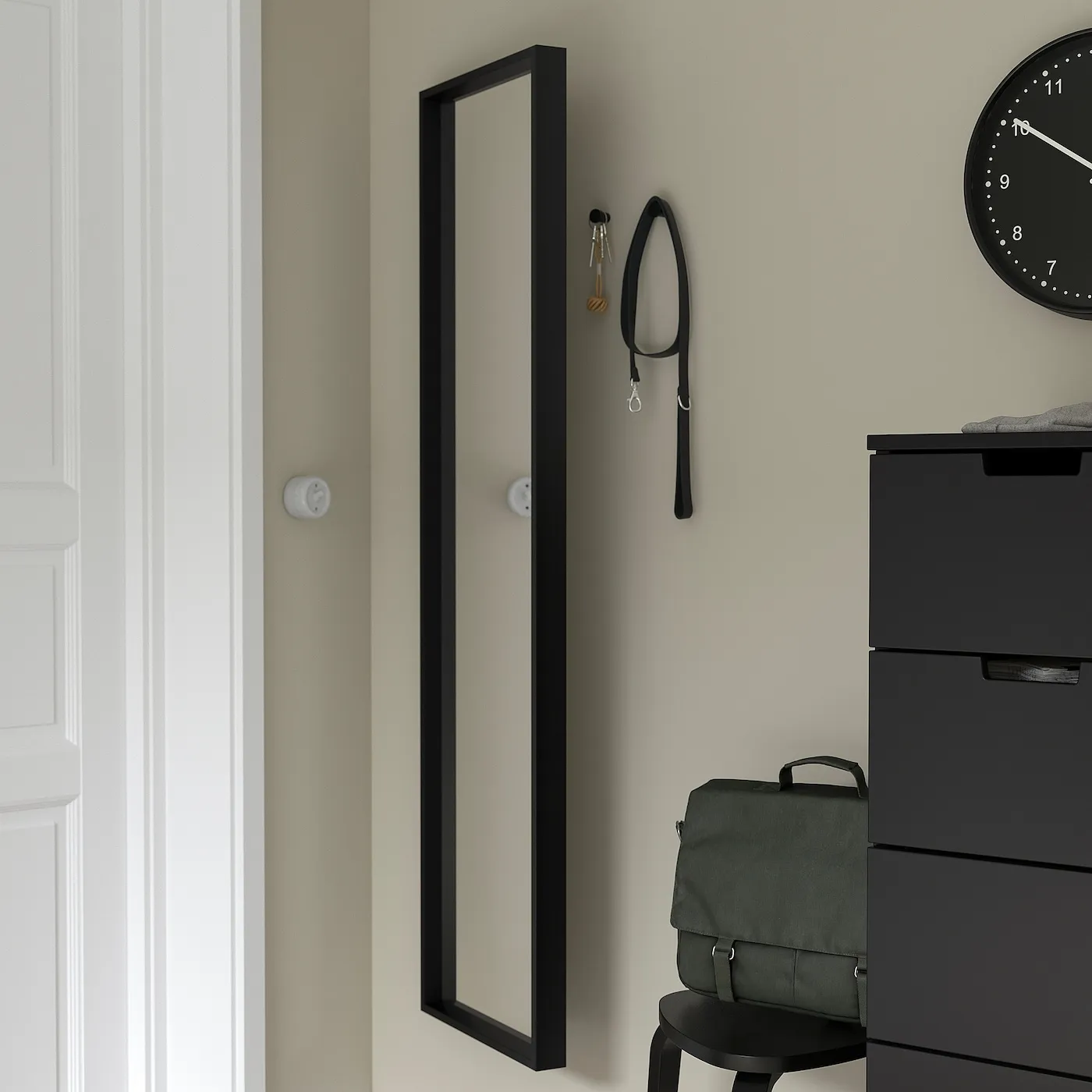 Вневременной дизайн прекрасно вписывается как в спальне, так и в ванной. Повесьте его вертикально или горизонтально — и при желании установите зеркало на петли, чтобы скрыть за ним крючки для ключей и других мелочей.