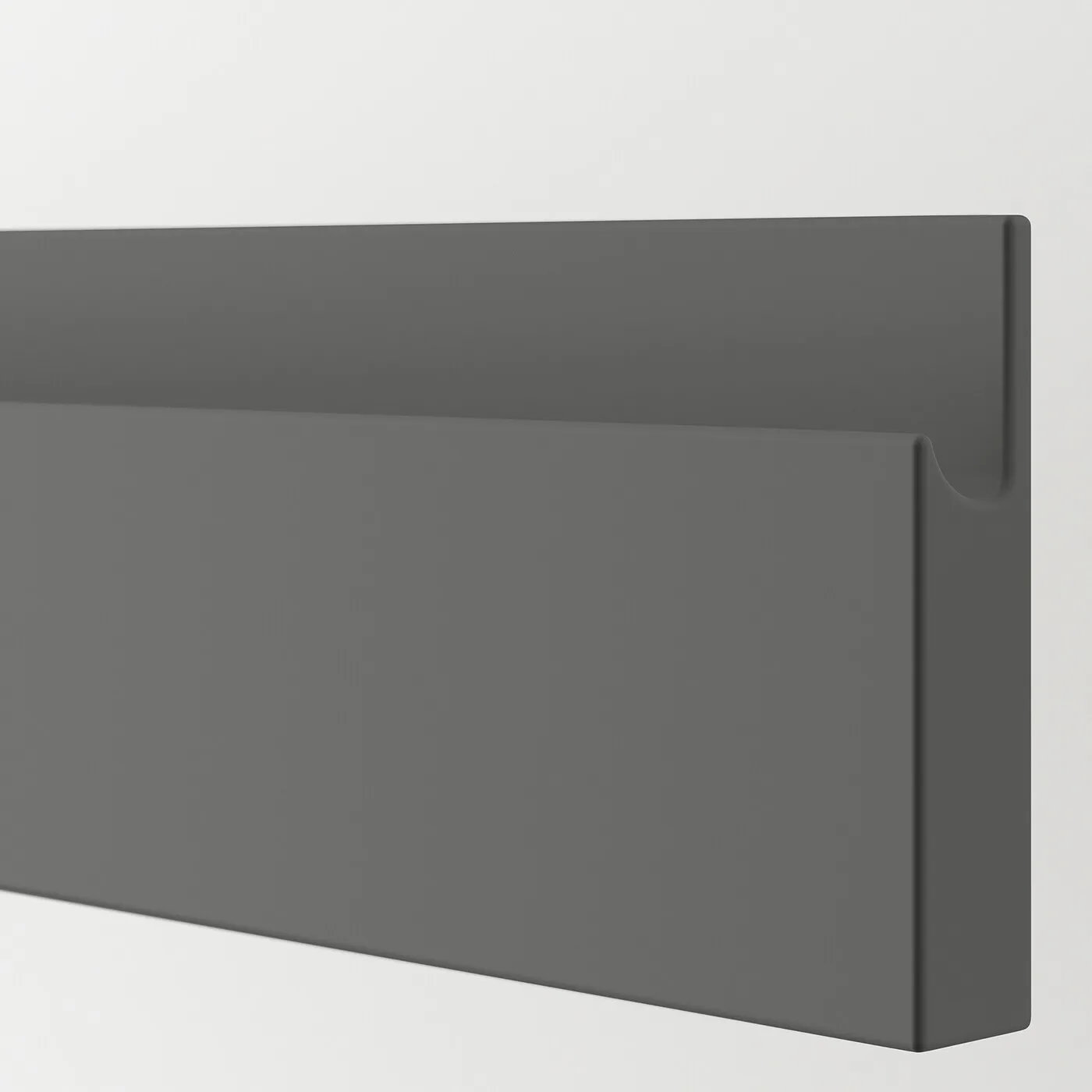 Фасады VOXTORP с матовой темно-серой поверхностью и четкими линиями создают современный вид, который кажется уютным и спокойным. Встроенные ручки идеально вписываются в дизайн, подчеркивая минималистичный стиль.