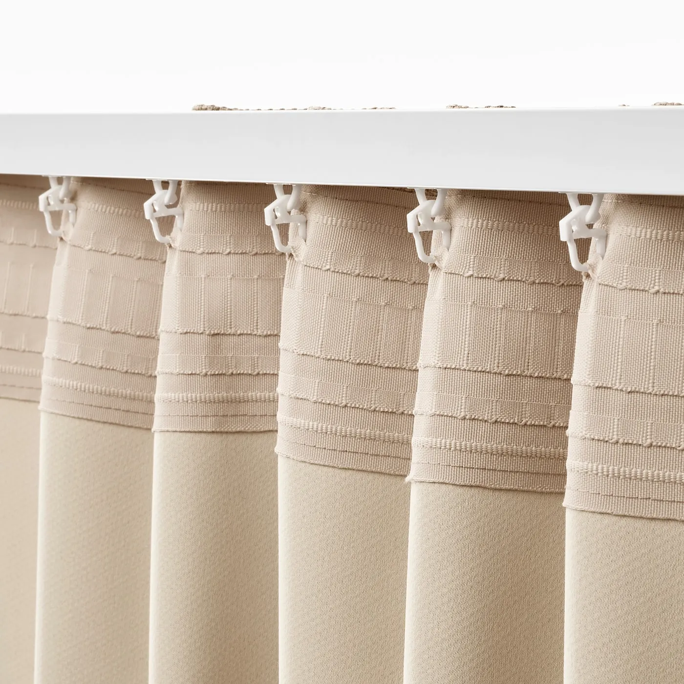 Обычно рекомендуется 16 ползунков и крючков для каждой шторы шириной 145 см. Вы можете уменьшить или увеличить их количество в зависимости от того, хотите ли вы узкие или более пышные складки.