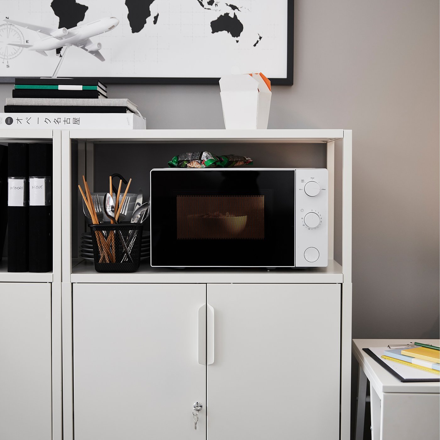 Храните такие вещи, как бумаги, папки и зарядные устройства за дверками, чтобы наслаждаться просторным пространством без беспорядка.