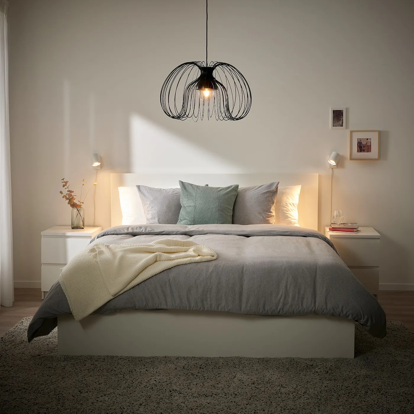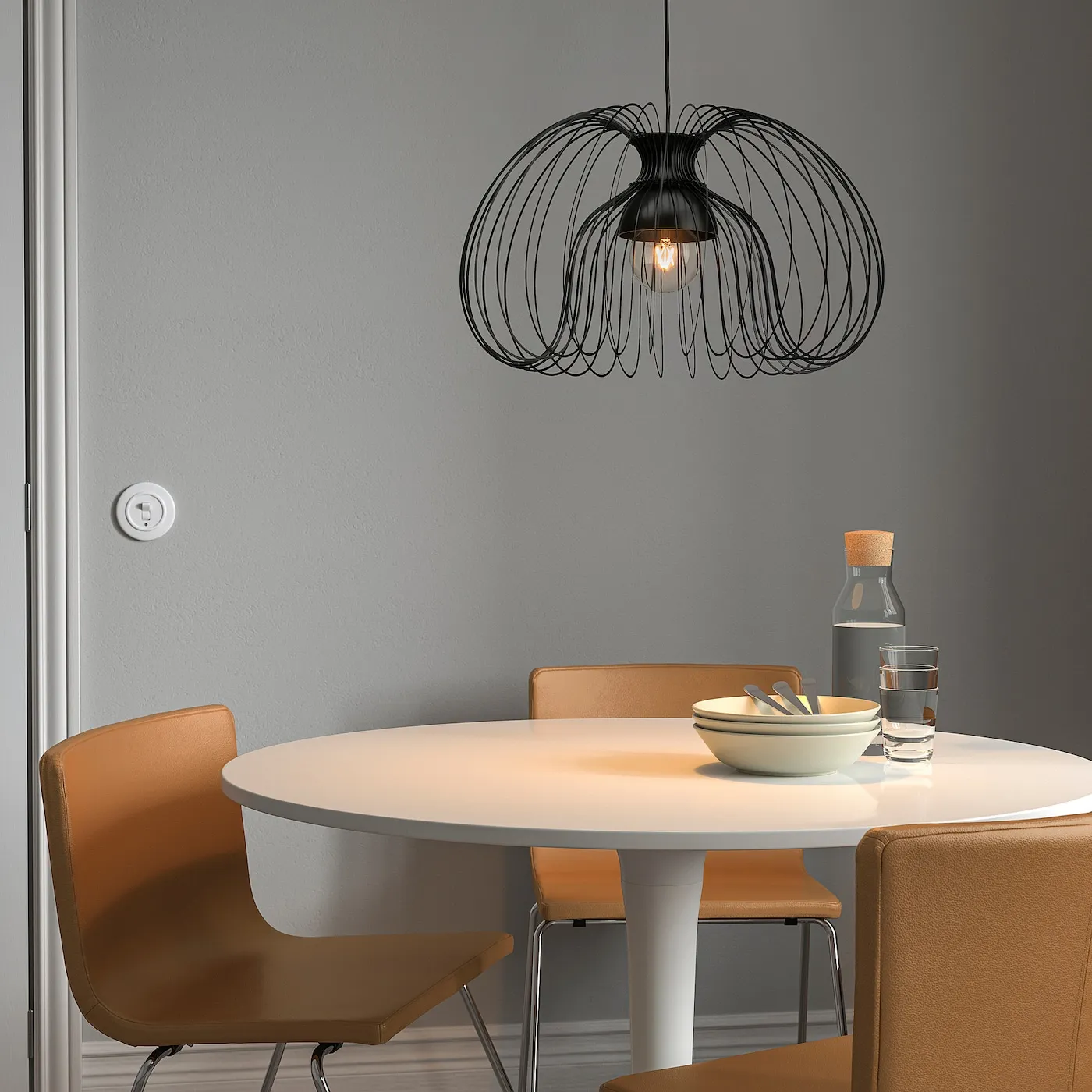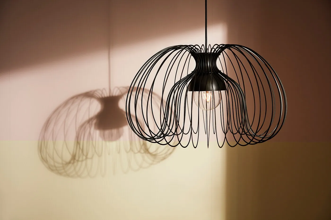 Легкий абажур, где выбор лампочки становится частью дизайна. Когда вы включаете светильник, свет рассеивается через изогнутые металлические прутья и создает увлекательные тени на стенах комнаты.