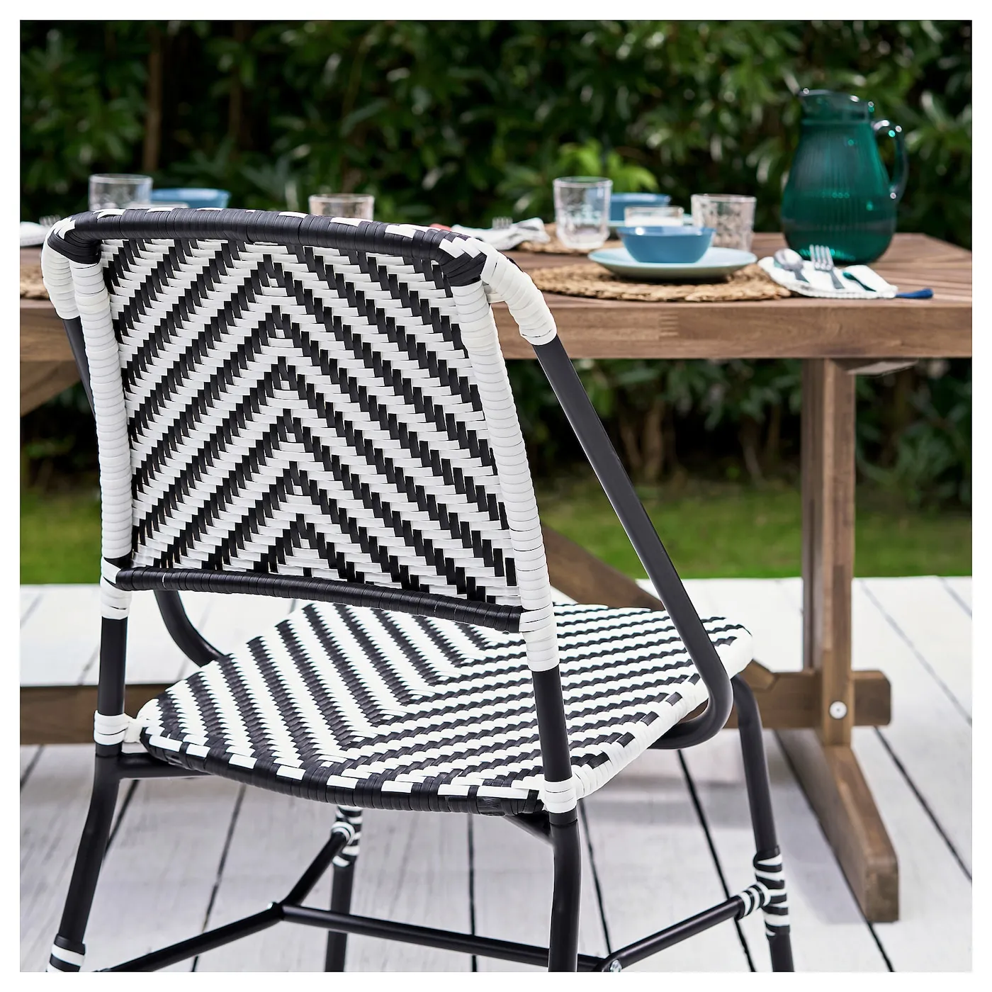 Вневременной графичный узор на сидении и спинке выполнен вручную из искусственного ротанга и завершен черно-белыми элементами вокруг ножек стула.