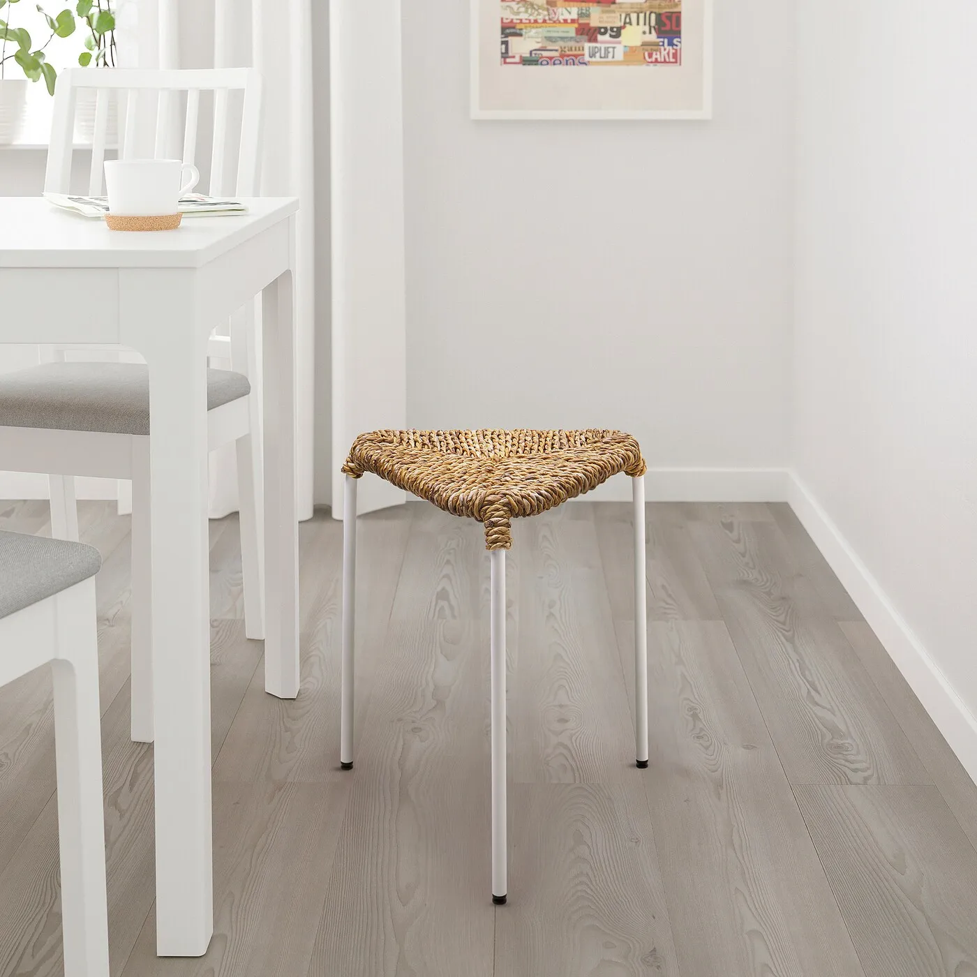Этот штабелируемый табурет на трех ножках с треугольным сиденьем, сплетенным вручную из волокон банана, является замечательным акцентом. Практичным станет, когда нужны дополнительные места для гостей.