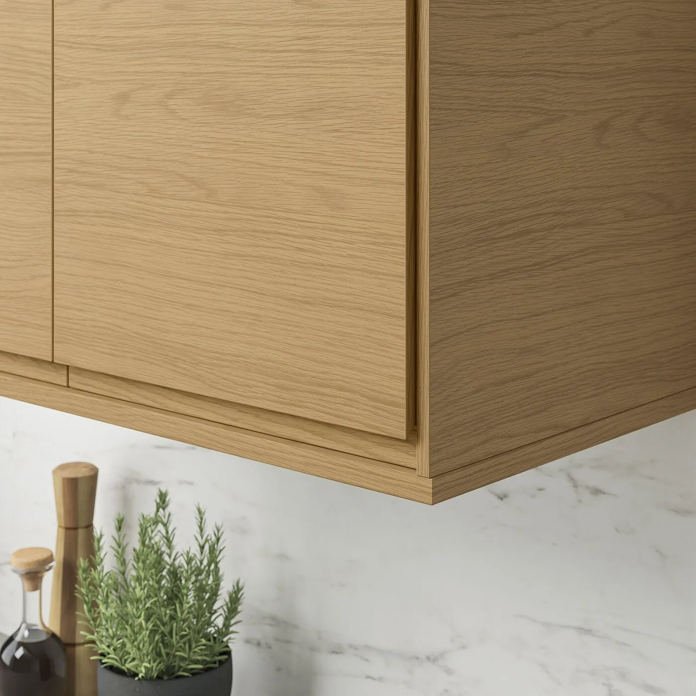 Кухонные фасады VOXTORP с дубовым эффектом придают интерьеру современный и элегантный вид, с теплом и характером. Декоративные молдинги создают единый стиль и подчеркивают общий облик кухни.